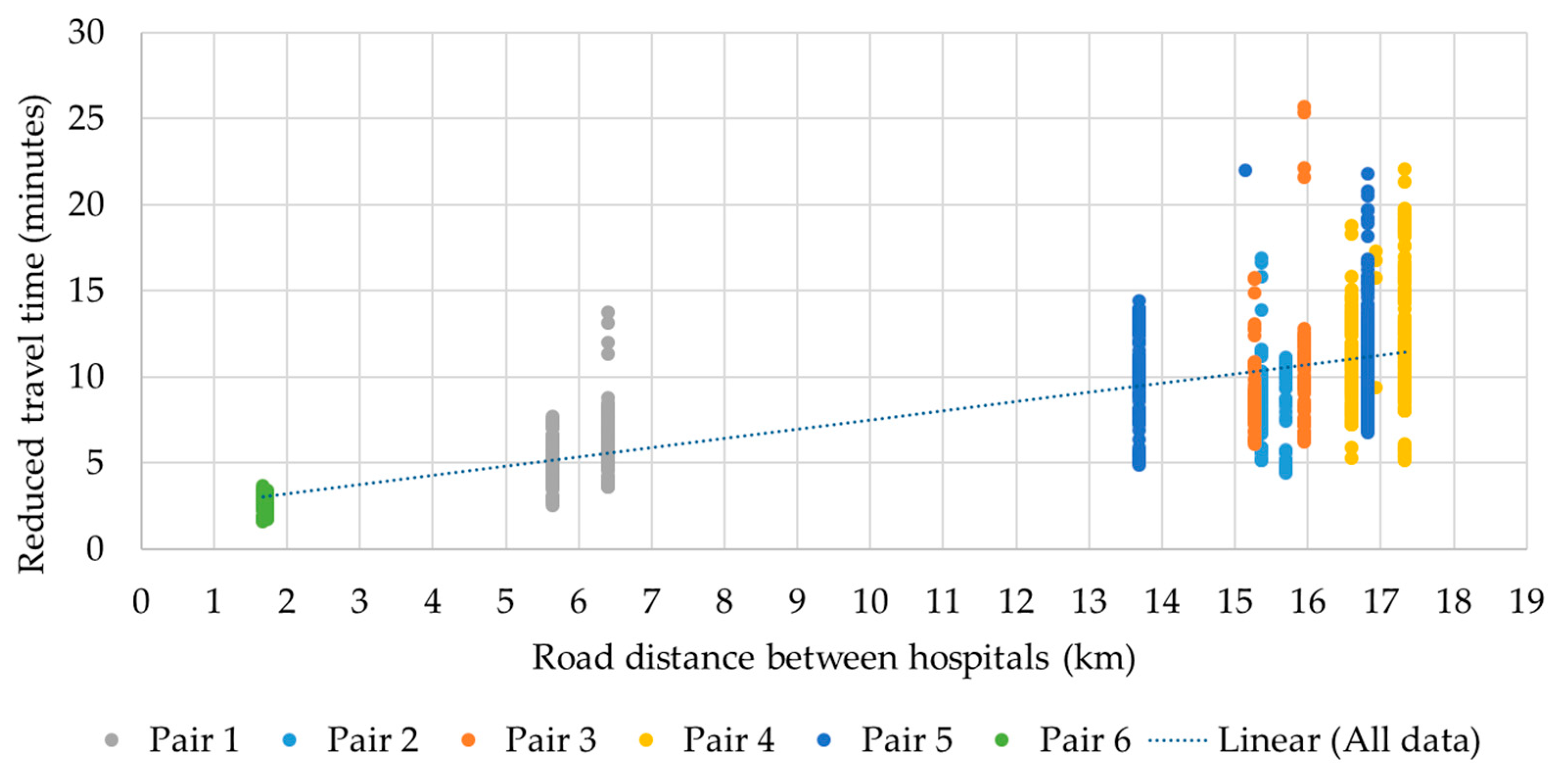 Figure 6 shows the correlation between road distance between hospitals and reduced travel time, which reveals how traffic variability affects flights with the same origin and destination. For example, flights covering an average distance of 8989 m and an average road distance of 16,947 m for hospital pair 4 exhibit significant differences in reduced travel time (from 5 to 22 min). It should be noted that the same hospital pair may result in different road distances depending on traffic congestion and routing direction. The linear trend line indicates a positive correlation between the road distance separating hospitals and the reduced travel time achieved.