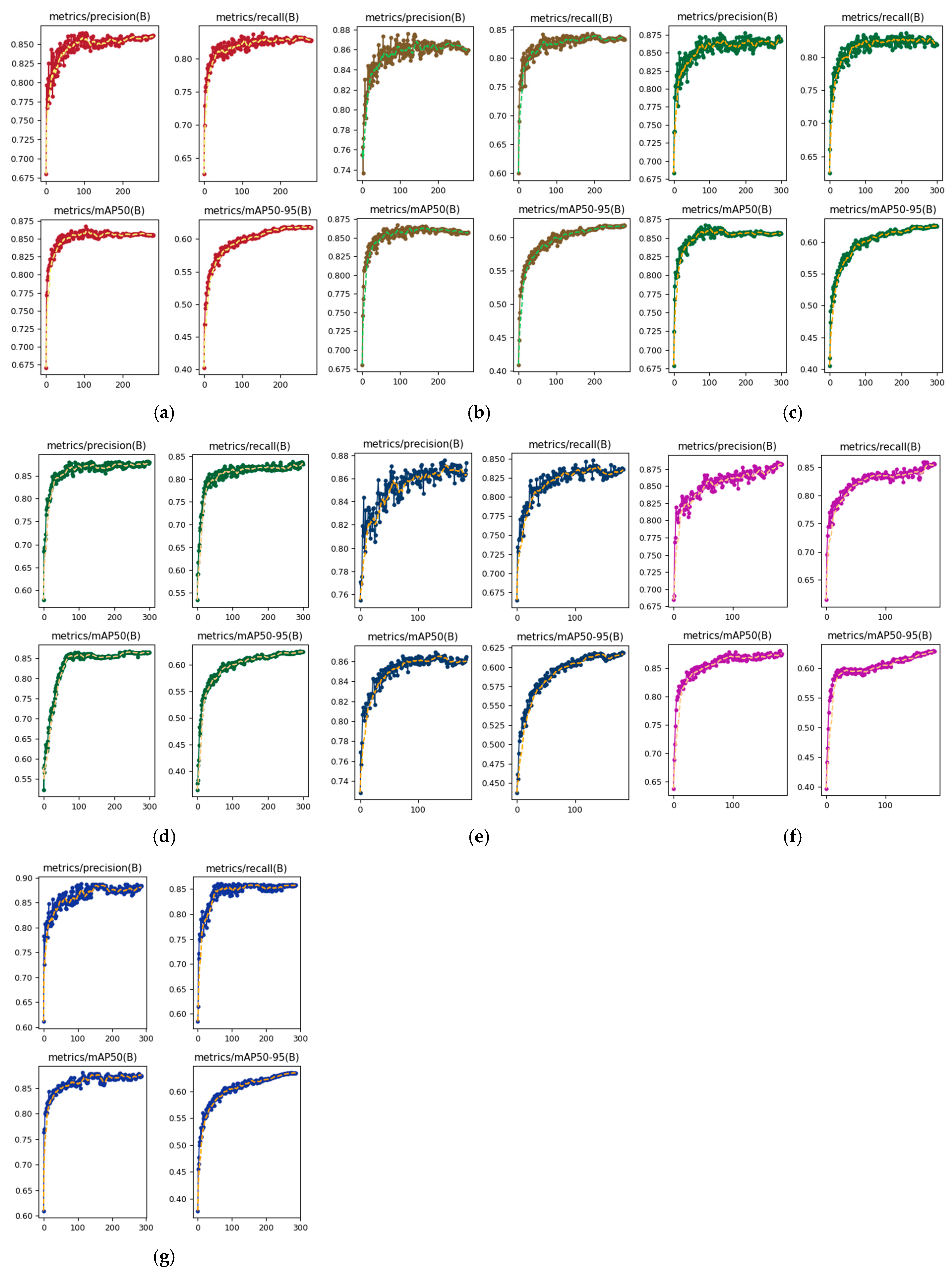 For training, 300 epochs were chosen as the maximum value using the AdamW optimizer with the following initial parameters: learning rate lr0 = 0.0001, batch size B = 16, and weight decay wd = 0.0005. Automatic accuracy bias and an early stopping mechanism were enabled if there was no progress in training for 50 epochs. All stages of training, validation, testing, and subsequent inference were implemented using an NVIDIA RTX 4090 GPU with sufficient throughput and memory for models of medium complexity. To ensure compatibility with the PyTorch and Ultralytics frameworks, the CUDA Toolkit 12.1 software stack was used under the Ubuntu 22.04 LTS operating system. The input resolution was fixed at 640 × 640. Mixed precision (FP16/AMP) was enabled. A gradient accumulation of two steps provided an effective batch size of 32. The learning rate followed cosine annealing with a 3-epoch warm-up, and an exponential moving average of the weights was maintained. A global random seed of 42 was set for reproducibility. The best checkpoint was selected by the highest mAP50–95 on the validation set, with metrics logged at every epoch.