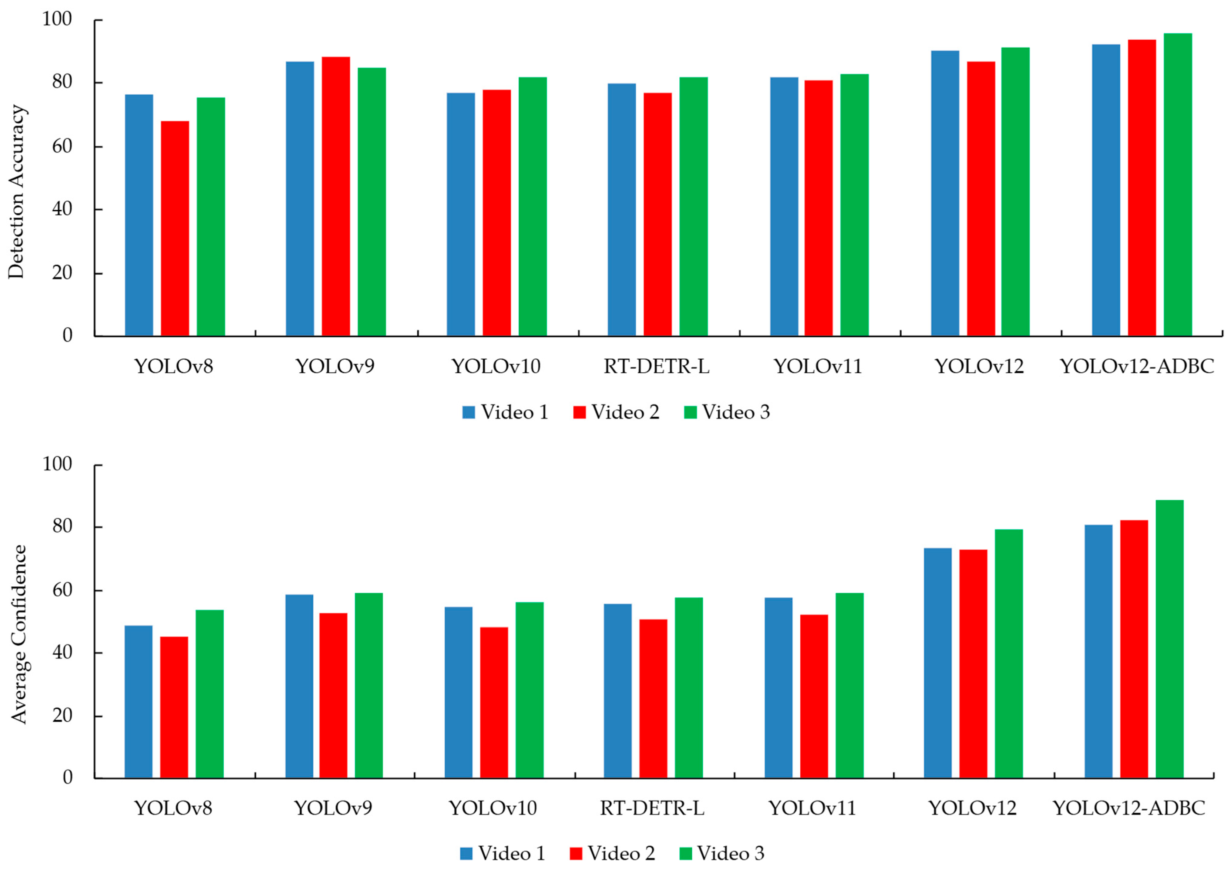 Figure 6) demonstrate the superior practical performance of YOLOv12-ADBC. The model attains the highest detection accuracy in all three videos, 92.16%, 93.41%, and 95.49%, whereas YOLOv12m reaches 89.73%, 86.61%, and 90.74%; the absolute gains are +2.43 pp, +6.80 pp, and +4.75 pp. YOLOv12-ADBC also provides consistently higher average confidence; 80.64%, 81.96%, and 88.57% versus 73.29%, 72.53%, and 79.14% for YOLOv12m, which corresponds to +7.35 pp, +9.43 pp, and +9.43 pp. In addition, the transformer baseline RT-DETR-L shows markedly lower values across all scenarios. Its detection accuracy is 79.61% on Video 1, 76.48% on Video 2, and 81.69% on Video 3, and its average confidence is 55.62%, 50.37%, and 57.48%. Relative to RT-DETR-L, YOLOv12-ADBC improves detection accuracy by +12.55 pp, +16.93 pp, and +13.80 pp for Videos 1–3, and raises average confidence by +25.02 pp, +31.59 pp, and +31.09 pp. These results indicate not only higher accuracy but also substantially more stable confidence estimates during continuous video inference. Such stability is critical in real-world monitoring, where reliable UAV recognition requires maintaining both accuracy and confidence across changing environments.