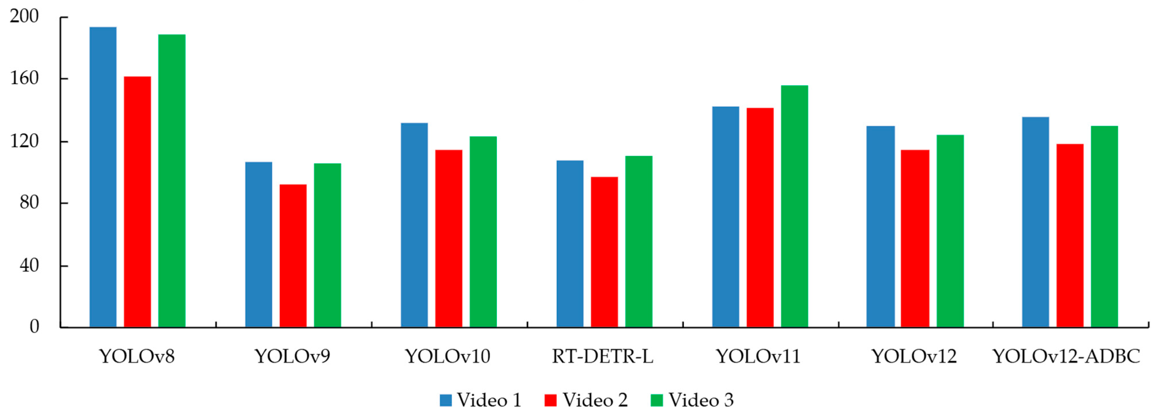 The only metric where YOLOv12-ADBC shows a relative disadvantage compared to other models is processing speed. Across the three video sequences (