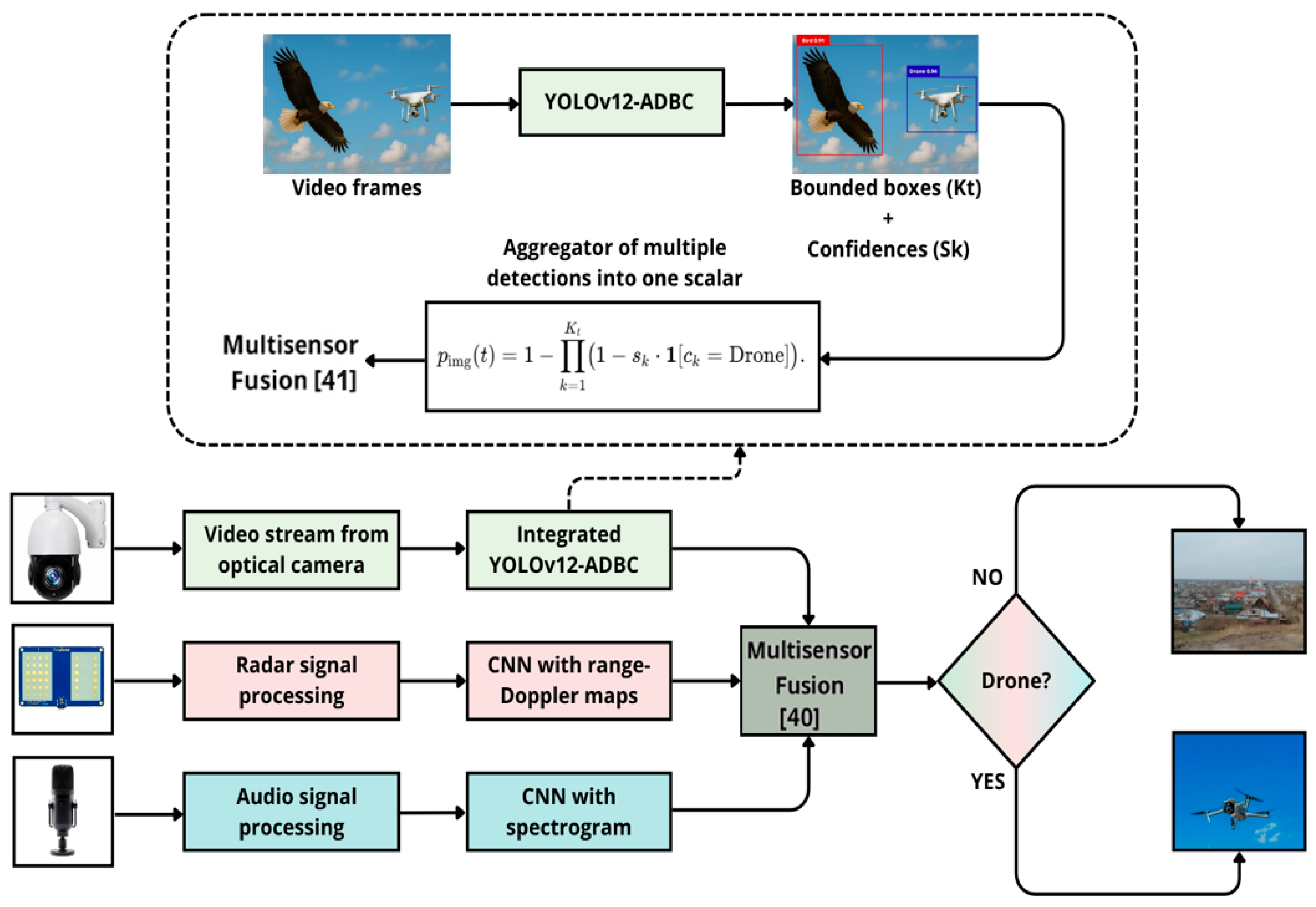 40], a CNN-based classifier pre-trained on ImageNet was used for the optical channel, which returned a scalar probability of the drone presence on each frame. Since the frequency of the YOLOv12-ADBC detector exceeds the frequency of the video camera (FPS = 30), exactly one scalar
