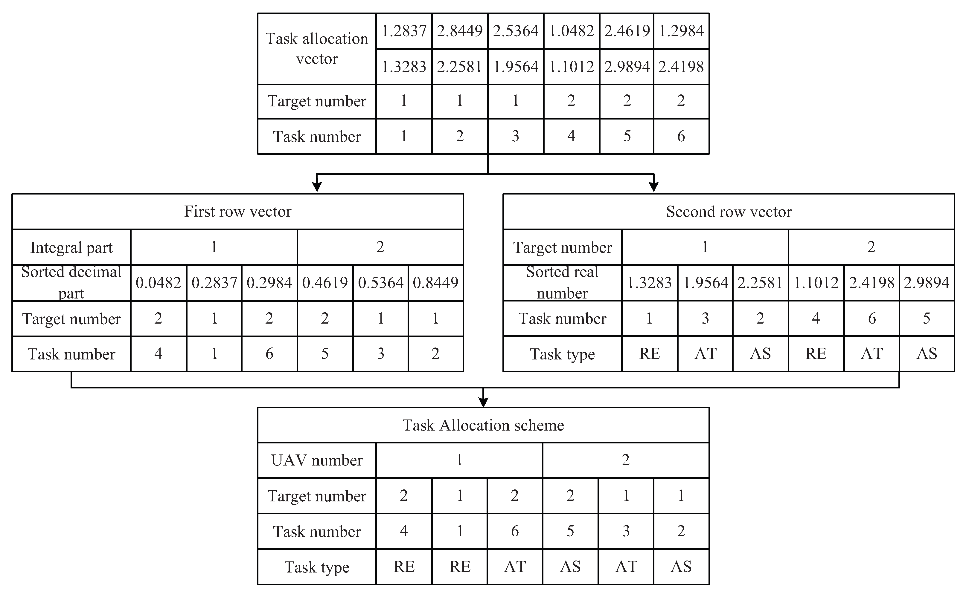 The task-allocation scheme is represented by a task-allocation vector, which comprises two rows. The length of each row corresponds to the number of targets multiplied by the number of task types. Each element in the first row corresponds to a task assigned to a target and is encoded as a real number. The integer part of this value indicates the UAV assigned to execute the task, while the fractional part denotes the task’s priority, with a smaller value representing higher priority. The elements in the second row are also real numbers and are used to determine whether the corresponding task is reconnaissance, supplies delivery, or assessment. For tasks associated with the same target, they are classified as reconnaissance, supplies delivery, and assessment in ascending order of the values in the second row.