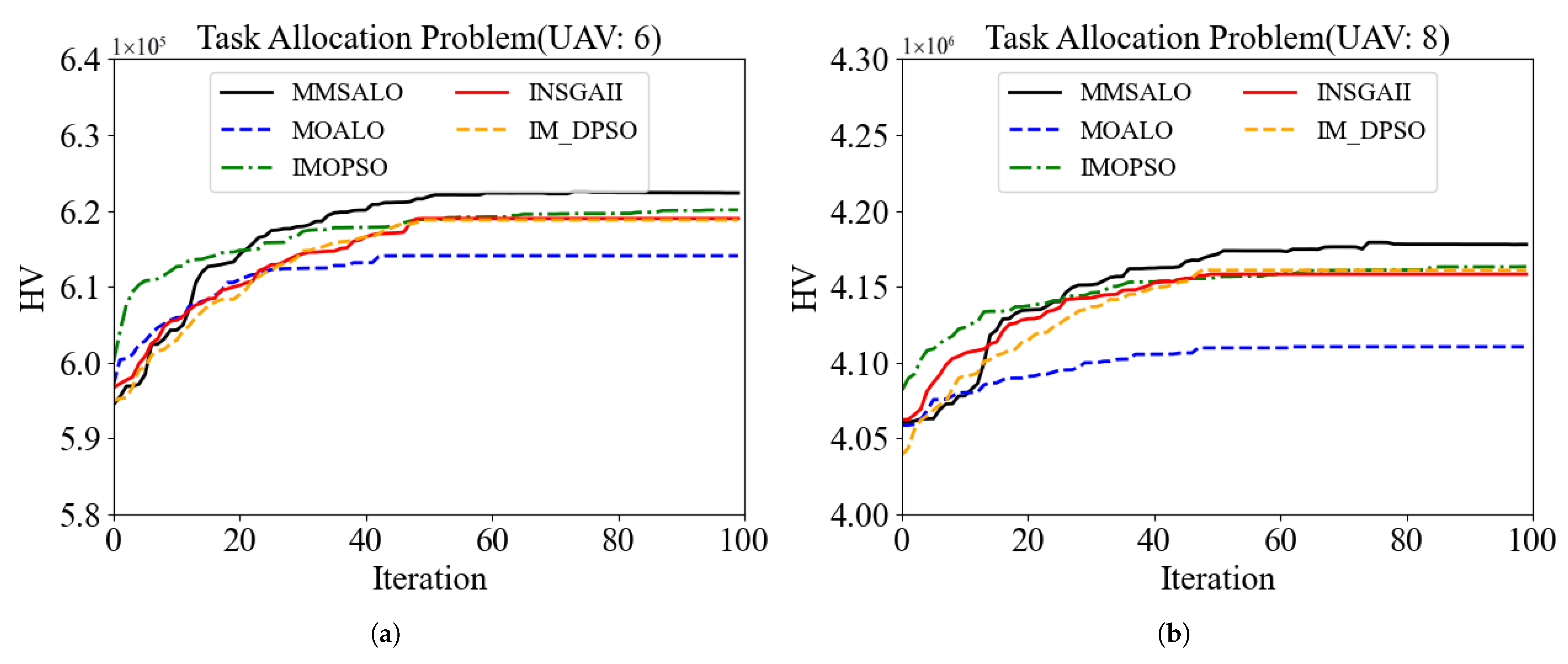 Collectively, MMSALO attains the highest HV value and outperforms the competing algorithms by a statistically significant margin. These results demonstrate that the sparsity selection mechanism, random boundary strategy, adaptive position update rule, and preference-based elite selection mechanism collectively enhance algorithmic performance, enabling MMSALO to provide an effective reference for analyzing multi-task, multi-constraint task-allocation problems in UAV swarms.