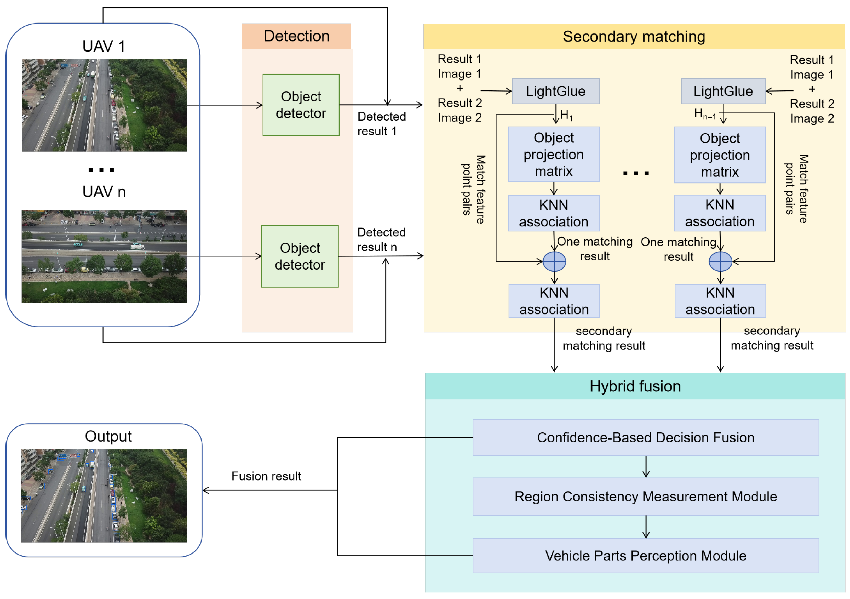 Considering that this paper objects multi-UAV tasks, detection results can be obtained from multiple sources. To more reasonably preserve these low-confidence results while reducing the risk of false detections, this paper proposes Confidence-Based Decision Fusion, which applies different confidence thresholds to filter the results from single-UAV and multi-UAV detections, respectively.
