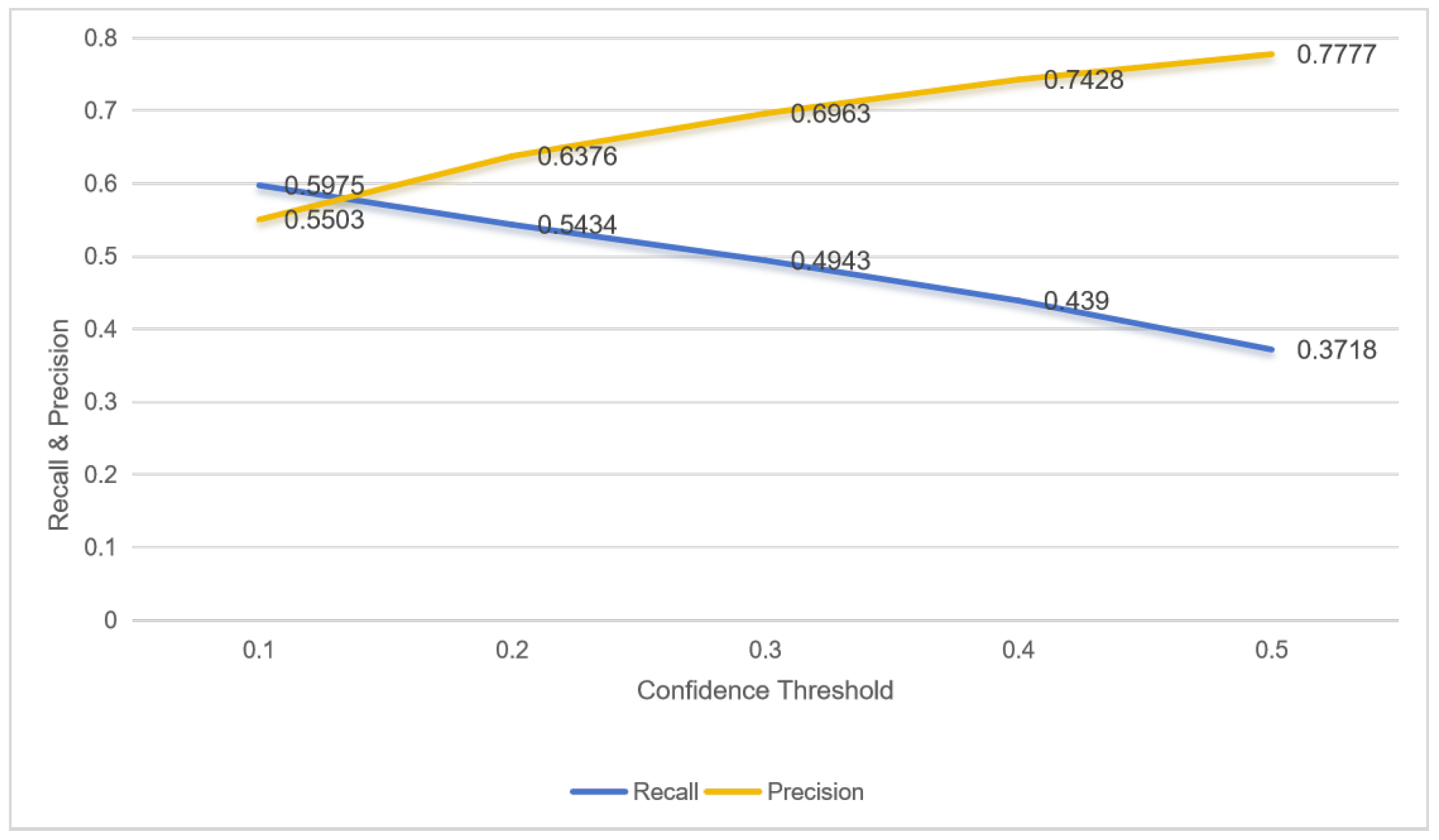 20]. This paper verifies this on the MDMT dataset using a single-UAV detection task, by varying the confidence threshold and calculating the recall and precision of occluded objects in the results. The trends of these two metrics with changing confidence thresholds are shown in