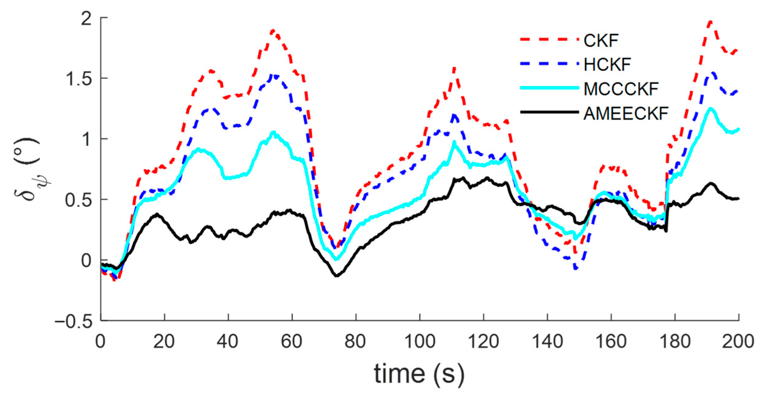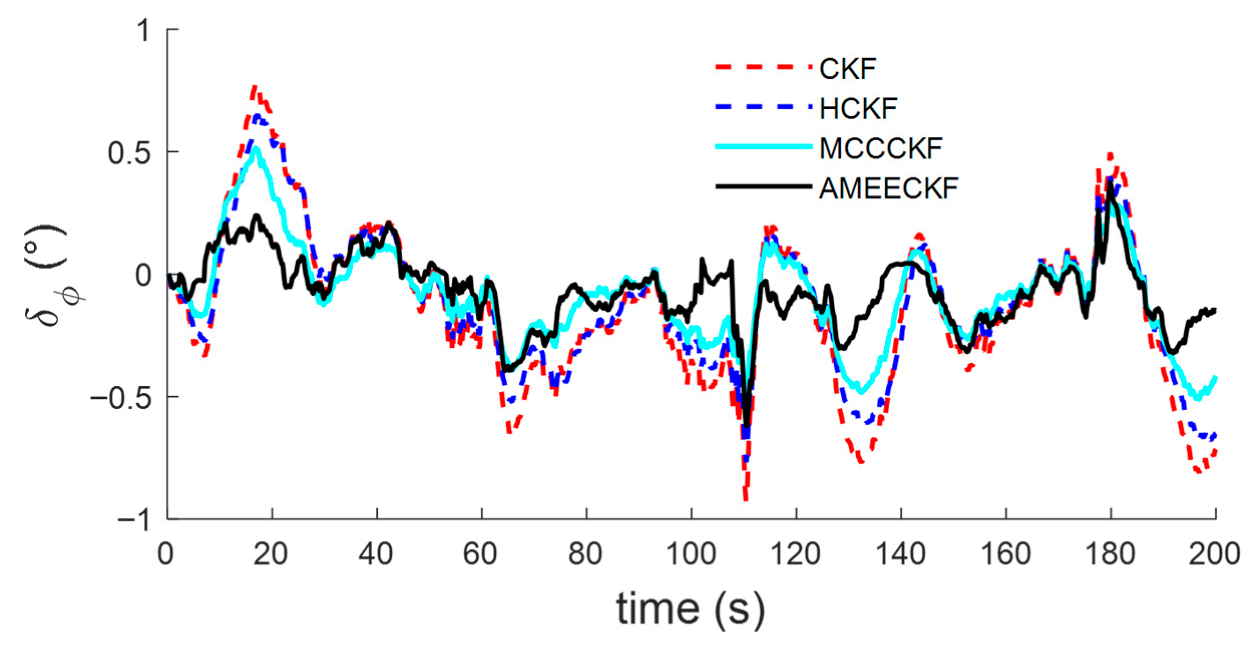 - Liu, X.; Qu, H.; Zhao, J.; Yue, P. Maximum Correntropy Square-Root Cubature Kalman Filter with Application to SINS/GPS Integrated Systems. ISA Trans. 2018, 80, 195–202. [Google Scholar] [CrossRef]