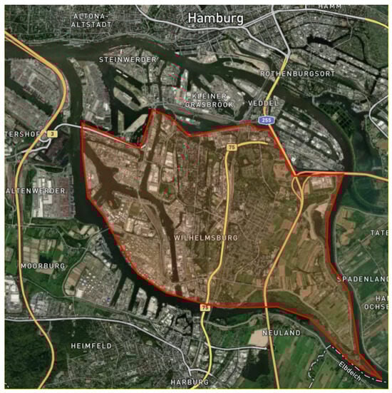 Map section for the planned U-Space covering parts of the Wilhelmsburg district in the Mitte district of the Free and Hanseatic City of Hamburg (Own representation based on OpenStreetMap).