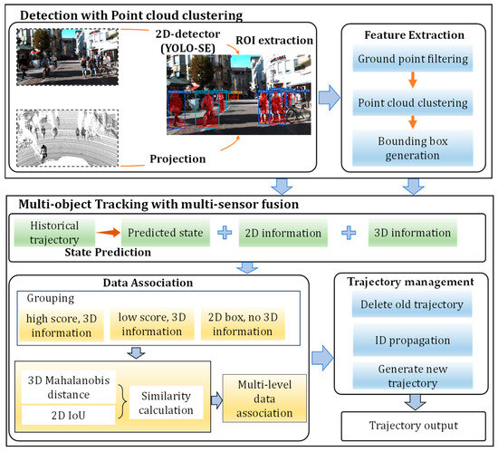 The key advantage of our object detection process lies in its independence from powerful computing devices and high-line LiDAR. It consists of five main steps: performing 2D object detection, extracting regions of interest (ROIs) from the point cloud, removing ground points, applying clustering, and generating 3D bounding boxes. The first step uses the 2D detector to obtain the objects’ class, location, and confidence score. The remaining steps focus on extracting the point cloud corresponding to the detected object. Since our tracking algorithm uses 2D IOU and 3D Mahalanobis distance in the data association process, our detection process outputs both the 2D bounding boxes and the 3D spatial coordinates of all objects. Any unused information will not be computed during the detection process, which can further enhance the algorithm’s operational efficiency.