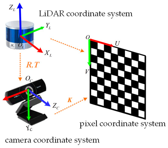In Equation (3), (, ) represents the coordinate of a point in the point cloud within the pixel coordinate system, and is the intrinsic matrix of the camera. The transformation matrices , , and are obtained through the sensor calibration process, which is a necessary step before running any multi-sensor fusion algorithm. The camera intrinsic calibration process provides the intrinsic reference matrix , while the joint calibration of the camera and LiDAR provides the spatial transformation matrices and .