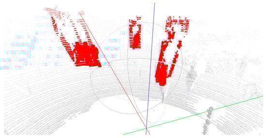 In Equation (4), represents the j-th region of interest in the point cloud at time t, which is associated with detection box , and is the i-th point contained in . As described in Equation (5), the location of each point in within the pixel coordinate system is constrained to lie inside the detection box . The set represents the output of the ROI extraction process, which includes the object point cloud along with some background noise.