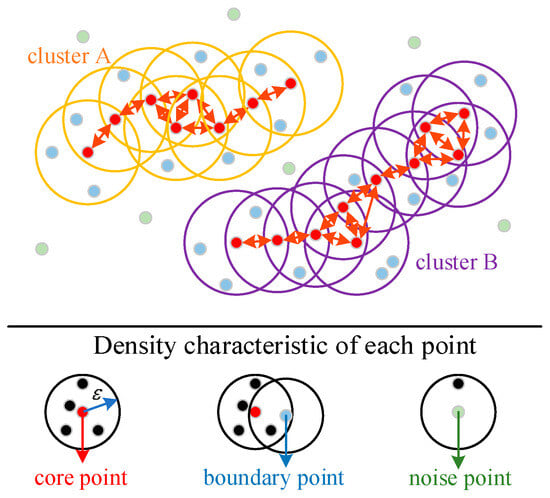As shown in Figure 5, DBSCAN algorithm divides the points in the data into three categories, which are core points, boundary points, and noise points.
