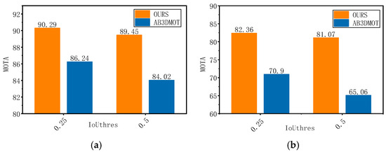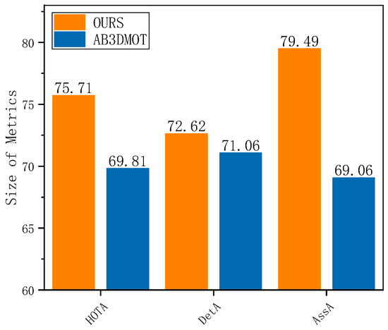 It can be observed that the adoption of multi-level data association improves tracking performance, with a particularly notable reduction in FRAG. While Methods A and B share identical FRAG metrics, our approach lowers this value from 30 to 11, indicating that the designed multi-level data association strategy helps prevent fragmentation of trajectories. During the object detection process, some partially occluded objects have few associated point cloud points, which makes the clustering process difficult to be carred out. As a result, Methods A and B directly discard these objects, since the Mahalanobis distance cannot be computed without clustered point clouds. Such cases cause some trajectories failing to be correctly associated with objects, ultimately leading to an increase in the FRAG value. In our method, the third data association stage is specifically designed to handle such cases. When 3D information is missing, it associates these targets with trajectories using 2D detection results, thereby significantly reducing trajectory fragmentation.