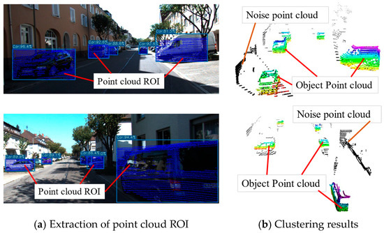 After filtering out the ground points, we use the DBSCAN (Density-Based Spatial Clustering of Applications with Noise) algorithm to extract object point clouds from the ROI point cloud. The DBSCAN algorithm can cluster point cloud clusters of arbitrary shapes within noisy data, aligning well with the requirements of our application.