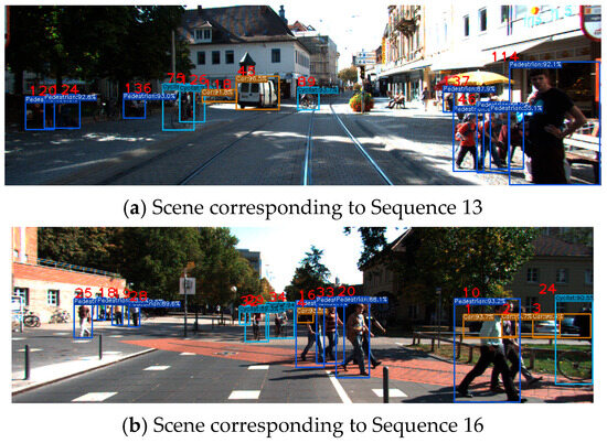 Table 5 presents the pedestrian tracking performance metrics of our algorithm on two KITTI sequences with high object density (sequences 13 and 16). The specific scenarios corresponding to the two sequences are shown in Figure 10. It can be observed that each scene contains a large number of pedestrians. Columns 2 to 3 of the table present the performance metrics of our method on sequences 13 and 16, respectively, while the last column provides the aggregated metrics across all 11 validation sequences. In sequences 13 and 16, the object detection performance is relatively poor, resulting in lower DetA values. Consequently, the overall tracking metric MOTA is also relatively low due to the impact of detection results.