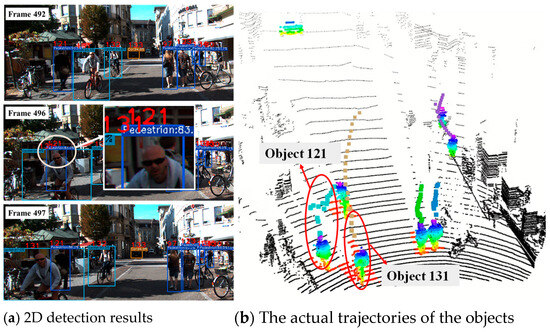 It is noteworthy that, despite the relatively poor detection performance in these two scenarios, the AssA values remain high, indicating that the accuracy of data association is not significantly affected by detection errors. In Figure 11, we present three frames of detection and tracking results, along with the corresponding trajectories in the point cloud coordinate system. In frame 496, the object 121 is occluded, resulting in a relatively small number of corresponding point cloud points. Under such circumstances, it is difficult to detect the target in 3D space. However, our multi-level data association strategy leverages 2D image data to maintain the target’s ID, thereby preventing trajectory fragmentation. Similarly, the IDs of distant targets remain unchanged under our algorithm, and their corresponding trajectories consistently retain the same color.