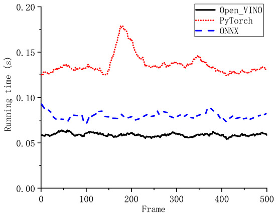 As the runtime of an object tracking algorithm is largely influenced by the detection process, this sub-section focuses on evaluating the efficiency of our detection method. To accurately demonstrate the practical value of our algorithm, we conducted efficiency evaluation experiments on a real vehicle platform, where the industrial computer was not equipped with a GPU. Before deploying the algorithm, we needed to convert the model, as the runtime efficiency of different model formats varies significantly in a CPU environment.