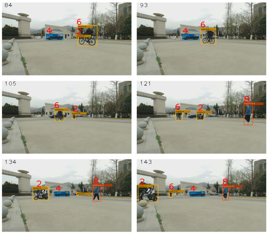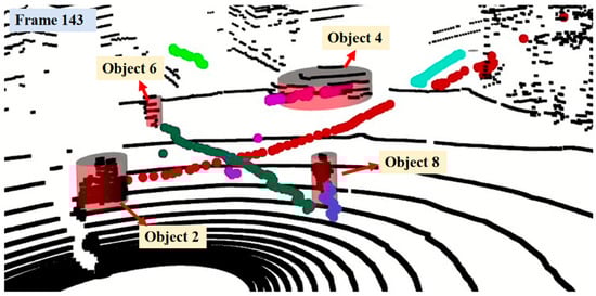 As shown in Figure 13, the 84th frame image includes the cyclist labeled as No. 2, the car labeled as No. 4, and the cyclist labeled as No. 6. However, mutual occlusion occurs among these objects in frames 93, 105, 121, and 134, resulting in the detector’s inability to accurately identify individual objects. In frame 143, when the detector re-detects these objects, our tracking algorithm correctly restores their respective labels. Figure 14 displays the point cloud data for the 143rd frame. The black points depict the raw LiDAR point cloud, serving as the detector’s input. The cylindrical bounding boxes represent the detector’s output, enclosing the detected object point clouds. The lines formed by points of different colors illustrate the historical trajectories of the tracked objects, where distinct colors correspond to different object labels. It can be observed that occlusion causes the trajectories not to be strictly continuous. Nevertheless, the trajectory of each object maintains a consistent color, demonstrating that occlusion does not cause trajectory fragmentation. Thus, this experiment validates the robustness of our algorithm in real-world scenarios.