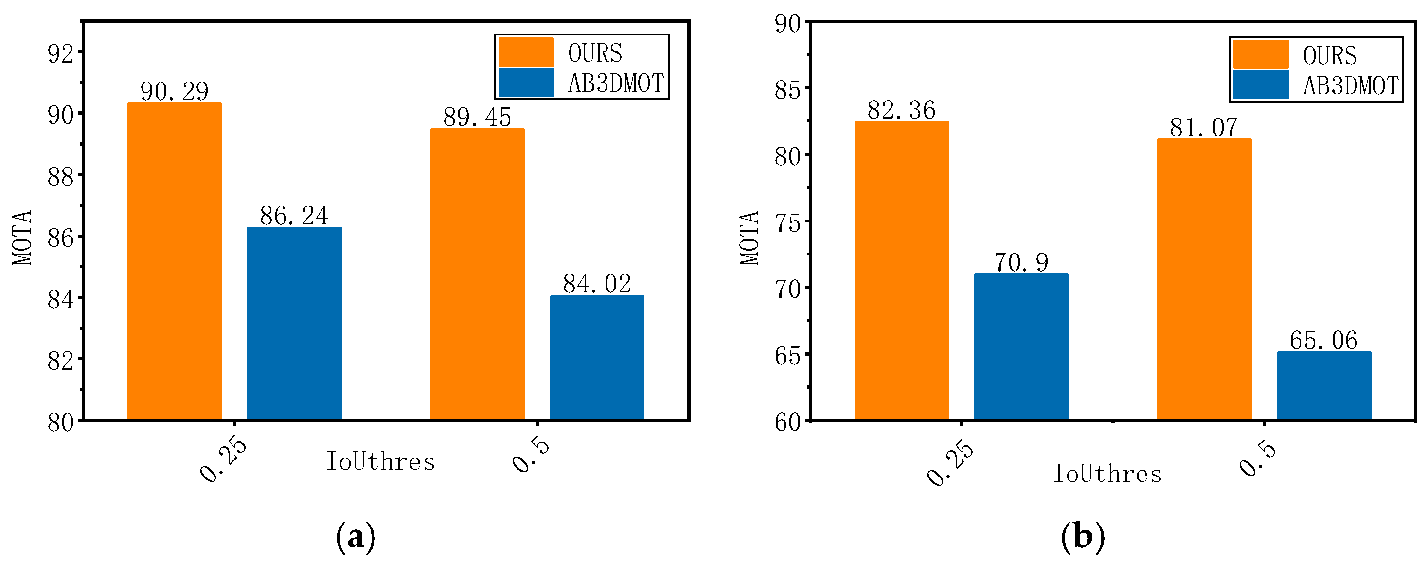 18], which was regarded as a benchmark method in the 3DMOT field. Their method uses Intersection over Union (IoU) to represent the similarity between detection boxes and prediction boxes, and then uses the Hungarian algorithm and Kalman filtering to complete trajectory updating. The tracking performance of this kind of algorithm is strongly correlated with the precision of the detected bounding boxes. However, the complexity of point cloud data makes accurately generating 3D detection boxes a challenging task in practical industrial applications. Moreover, in real-world environments, the rapid changes in object pose often hinder the ability of 3D IoU to accurately quantify the similarity between detection results and trajectories [