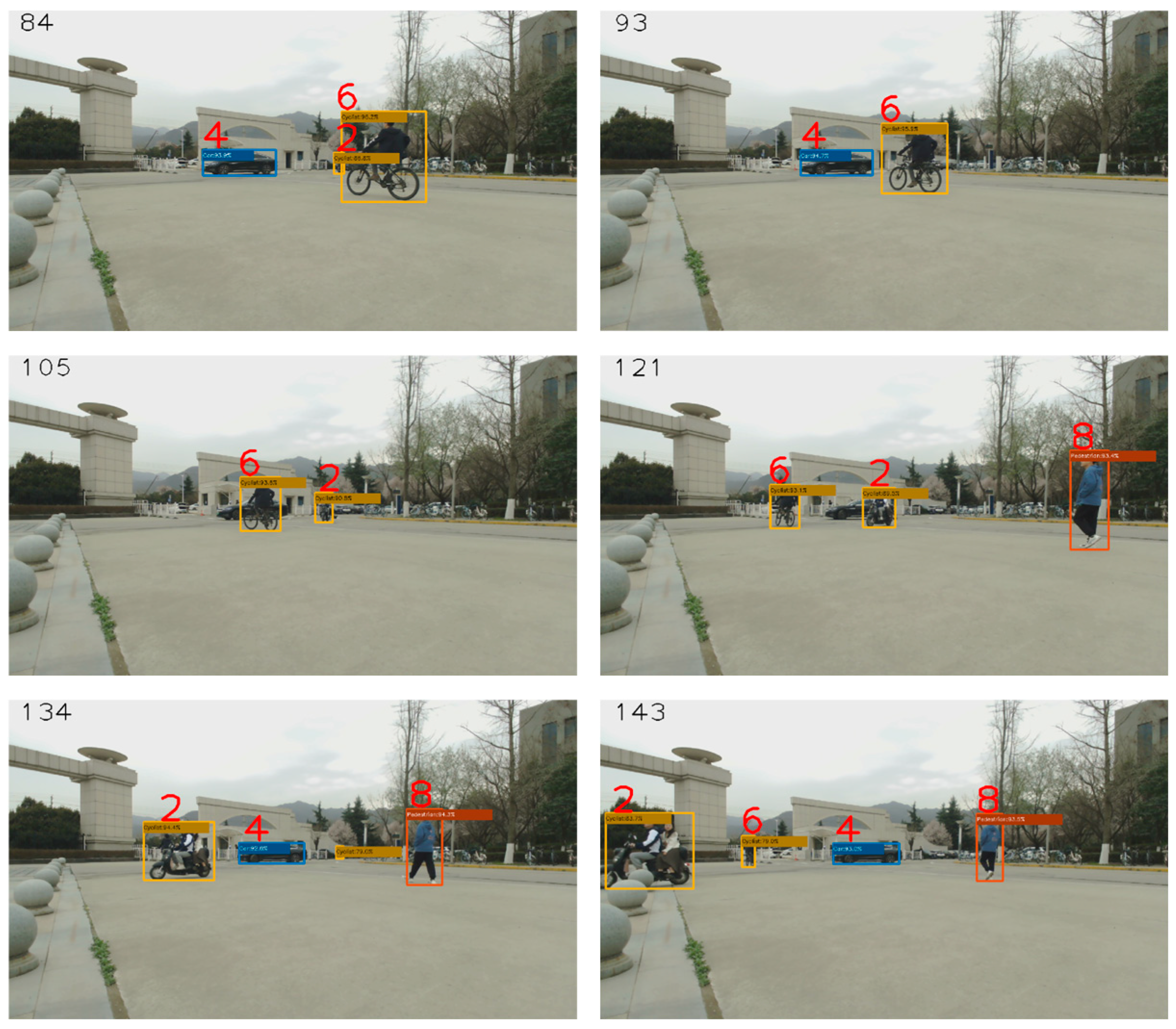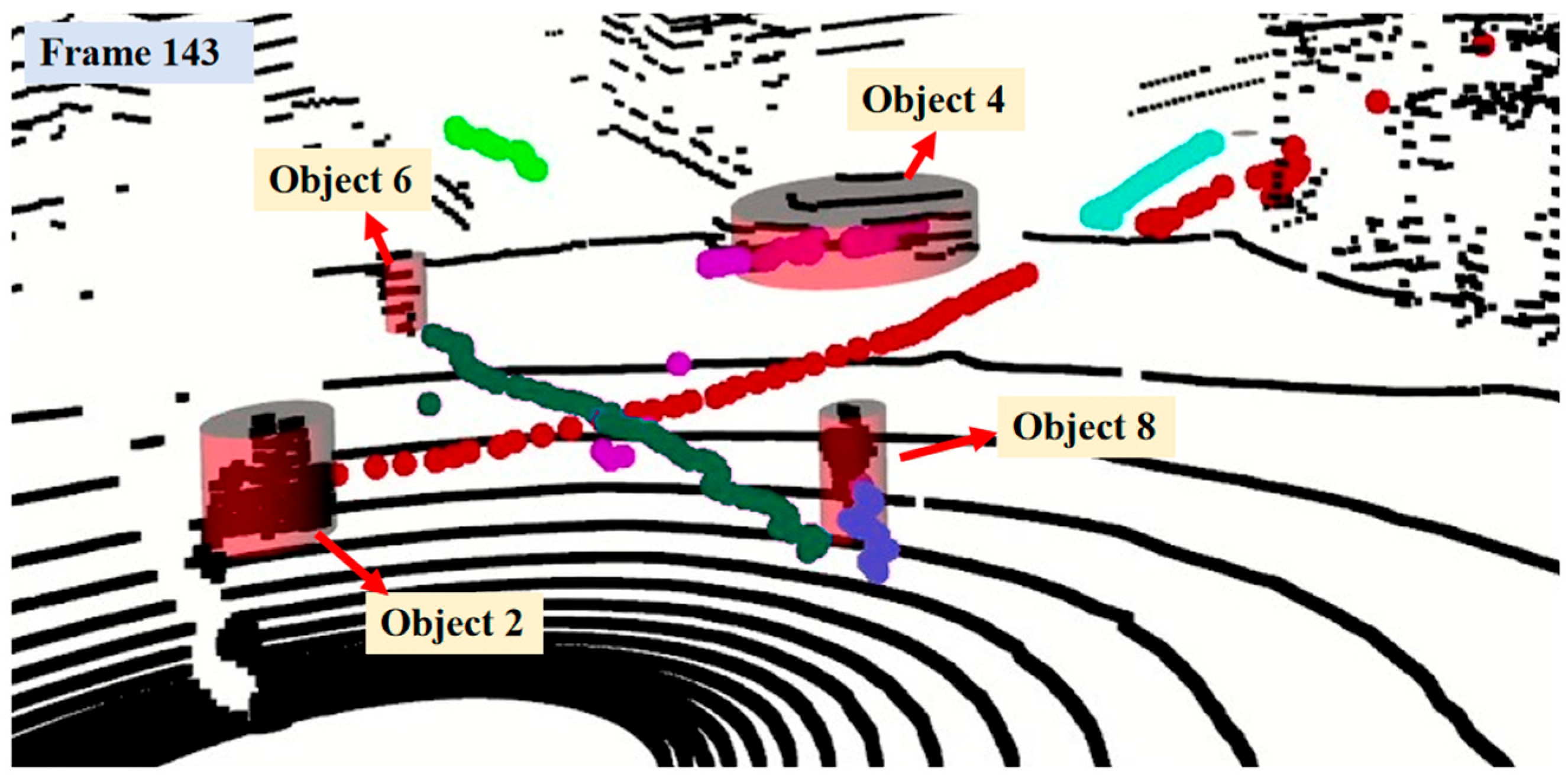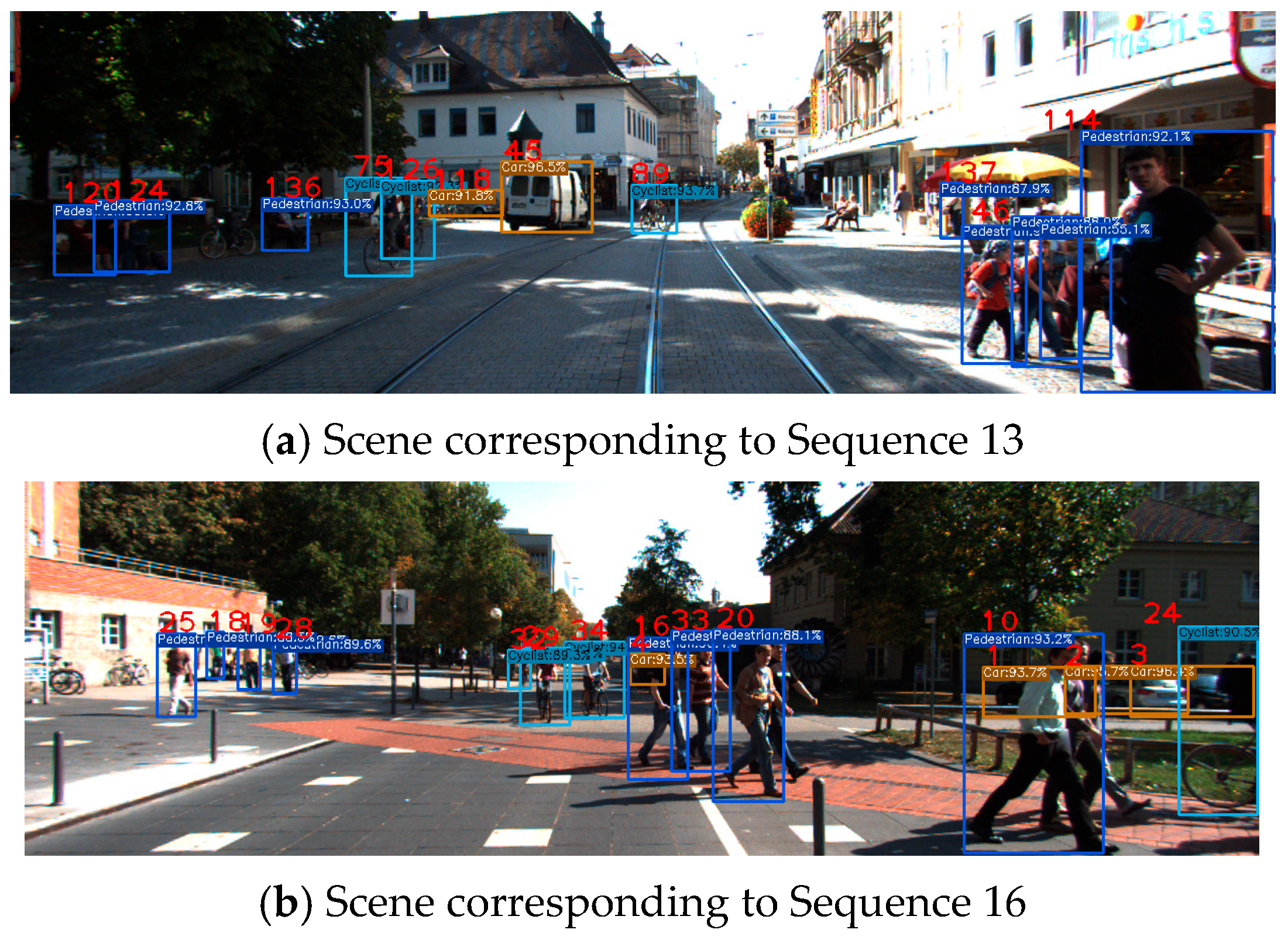 In Equation (10), is the information of the j-th object detected by our algorithm at time t. It includes the 2D bounding box, object category, confidence score, and the center coordinates of the corresponding object point cloud. During the tracking process, this information serves as the observation data for the state update step.
