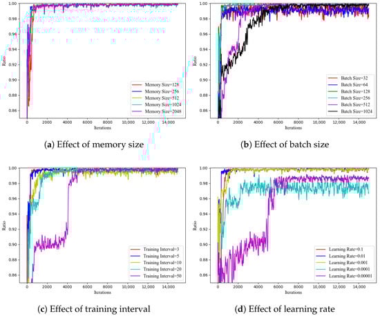 - Algorithm parameters: We choose a fully connected DNN consisting of one input layer and two hidden layers with 120 and 80 hidden neurons, respectively, and one output layer in our proposed QO2 algorithm (the 2-layer architecture with 120 and 80 neurons was selected through a systematic hyperparameter search, which explored configurations with 1–3 layers and various neuron combinations. This configuration demonstrated optimal convergence and robustness across different parameter settings.). Via experiments, we finally set the memory size, batch size, training interval , and learning rate of Adam optimizer as 1024, 128, 5, and 0.01, respectively. Additionally, we set sample parameter as 1 to balance policy efficiency and stability.