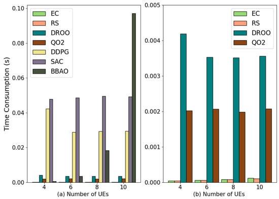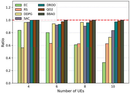 - Soft-actor–critic method (SAC) [46] scheme: Taking the wireless channel gain between the UE and the edge server as input, use SAC to output binary offloading decisions, and obtain the optimal system utility as a reward to train the SAC policy.