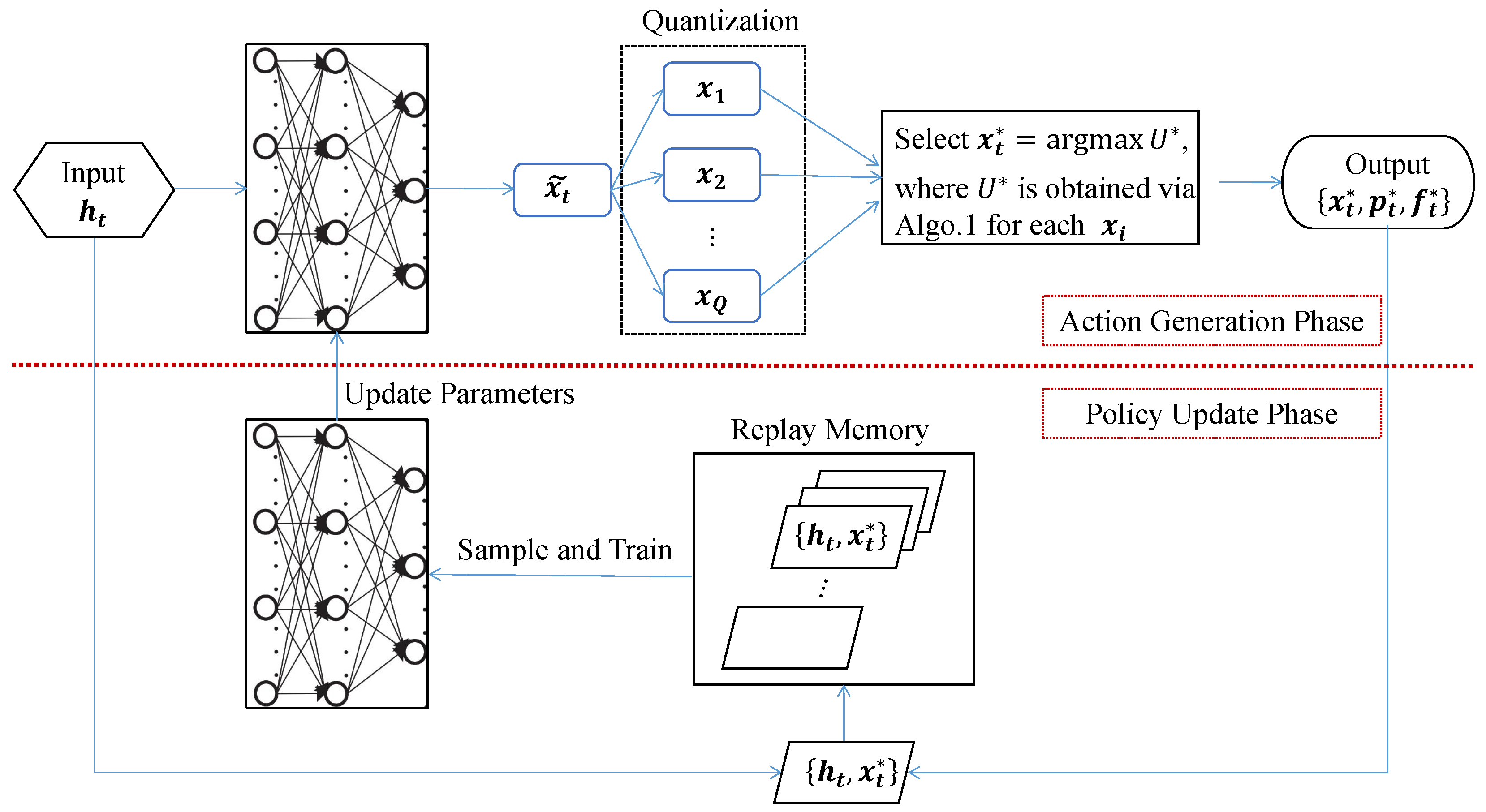 - Sample Strategy: We sample a batch of data , marked by a set of time indices to train DNN (the reward signal is implicitly encoded in through the utility-maximization process. Specifically, is selected as the candidate achieving the maximum utility value among quantized alternatives, thus representing the optimal reward-maximizing action under the given channel state .). Intuitively, the latest data comes from a smarter DNN, and thus contributes more to policy update. However, relying solely on latest data to train DNN would lead to poor stability. To achieve a better balance, we propose a PPS strategy. Specifically, we record sample frequency of data i as , based on which we set its sample priority as . Here, is a coefficient to balance update efficiency and stability. Then, data i would be sampled with probability of . As shown in Section 5, PPS method outmatches Random Sampling (RS) method [50] and Priority-based Sampling (PS) method in terms of convergence rate and stability, respectively.