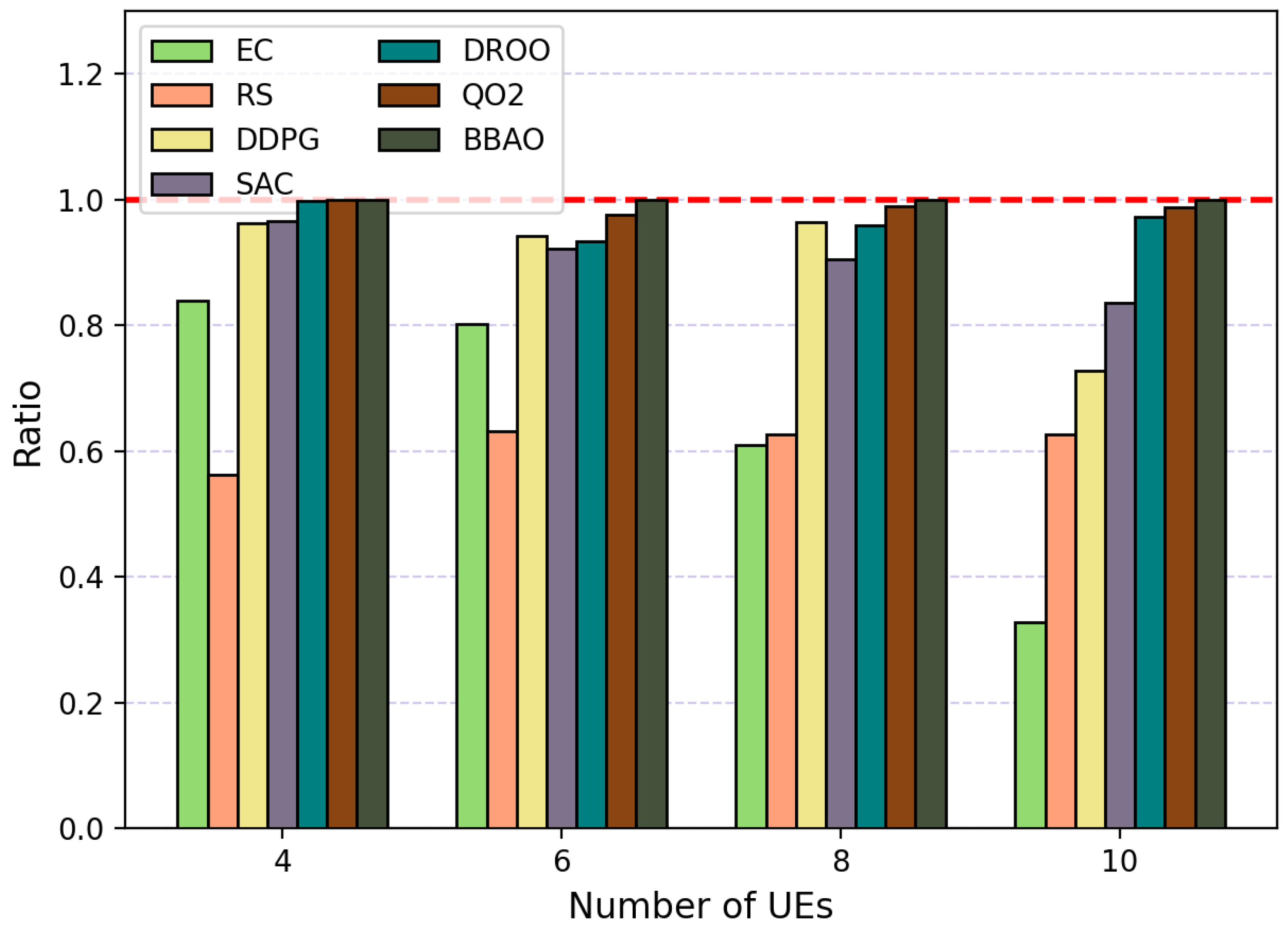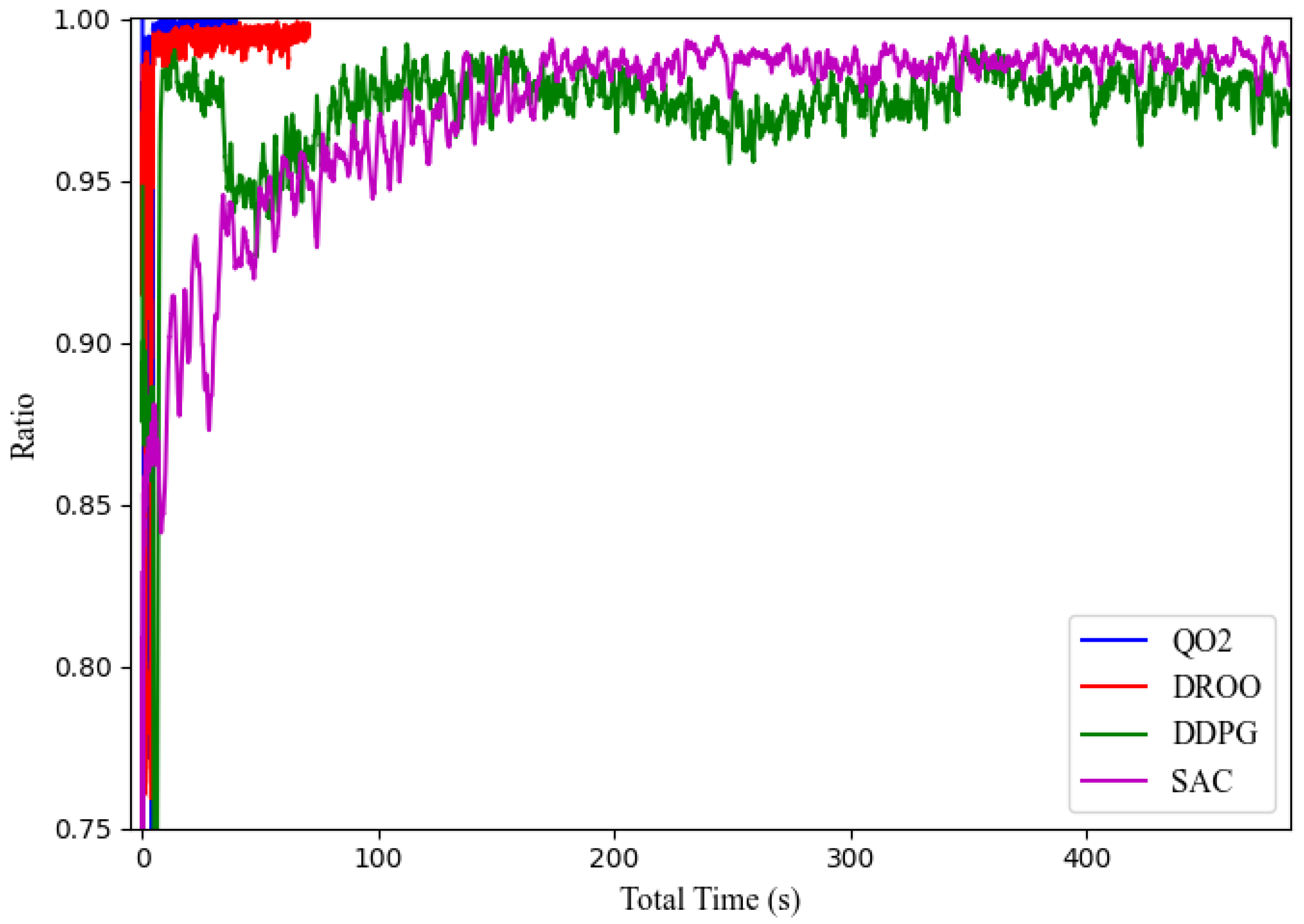 - Deep deterministic policy gradient (DDPG) [44] scheme: Similar to SAC scheme, use DDPG to take the wireless channel gain as input to output binary offloading decisions, and obtain the optimal system utility to train the DDPG policy (to ensure a relatively fair comparison, SAC and DDPG are integrated into QO2 framework via replacing the DNN component, rather than being standalone implementations of the original algorithm).