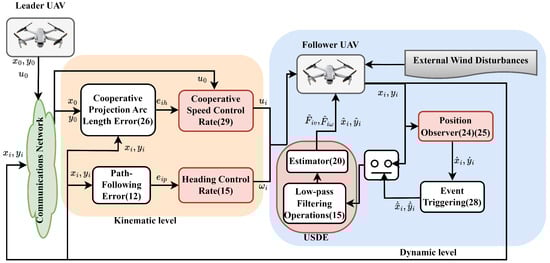 The cooperative following control strategy for UAV clusters with spatio-temporal decoupling characteristics is explored in this section. To mitigate the stringent requirement of the time domain in the traditional trajectory tracking process, both the heading controller and the velocity controller are designed based on the LMI theory to fulfill the tasks at the prescribed spatial and temporal levels, with the projected arc length integrated into the velocity controller. The USDE is introduced into each controller to estimate the system perturbation, and to enhance the system’s perturbation resistance through the amalgamation of an event-triggered mechanism with a position estimator. In this paper, the overall system control block diagram is shown in Figure 1. It illustrates the overall cooperative path-following architecture for the leader–follower UAV system. The leader generates the desired trajectory and reference velocity, while each follower tracks this information through two coordinated control loops: a spatial loop that corrects position and heading errors , and a temporal loop that adjusts velocity errors to maintain formation consistency. A USDE module estimates external disturbances and feeds them forward to enhance robustness, and an observer with a dynamic ETM provides intermittent state updates from neighboring UAVs to reduce communication load. The signal arrows in Figure 1 represent the main information flow—from reference generation, error computation, and disturbance estimation to control output—corresponding respectively to Section 3.1, Section 3.2, Section 3.3 and Section 3.4 for detailed explanation.