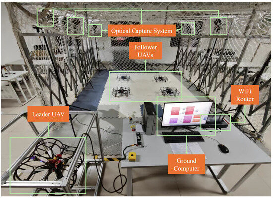 To validate the proposed collaborative control strategy, a small-scale “air-ground integrated” experimental platform was constructed, as shown in Figure 3. The leader aircraft was mounted on a 360° rotatable active pylon and powered by a constant-voltage power supply, enabling it to complete sustained hovering and attitude perturbation tests indoors. The four followers, completely independent of external power supply, took off using their own batteries, forming the “air ring” (Figure 4) around the leader aircraft to form a dynamic five-aircraft formation.