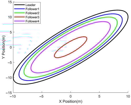 Consider the external wind disturbances suffered by each UAV as , , , . The initial conditions for the position and heading of the pilot and follower are set to , , , , respectively.
