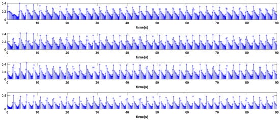 The triggering moments of the system are shown in Figure 8, with the horizontal axis indicating the moment of trigger occurrence and the vertical axis indicating the duration of this trigger. The four follower control signals are updated exclusively when the trigger condition is satisfied. The number of event triggers in the time interval [0, 10 s] are 64, 65, 65, and 69, indicating that no Zeno behavior occurs. The event trigger times for each UAV are shown in Table 3. Therefore, the designed trigger conditions can effectively reduce the demand for communication resources and improve the utilization efficiency of network resources.