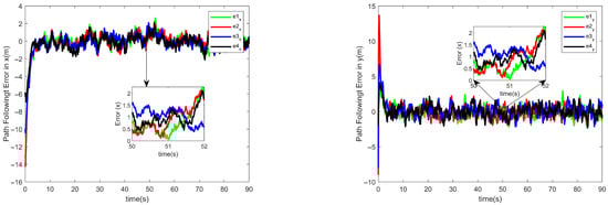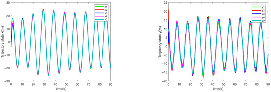 To verify that the control task in this paper can be realized, the simulation results are shown in Figure 5, Figure 6 and Figure 7. The cooperative projected arc-length errors among the four follower UAVs are shown in Figure 5, with the final error converging to near zero, thus proving the realization of the temporal and spatial tasks in the previous section. While Figure 6 and Figure 7 show the estimated state of the four follower UAVs in the x and y directions, respectively, compared to the original state, thanks to the combination of the designed position observer and USDE, which improves the system’s anti-interference capability and can effectively compensate for unknown perturbations, thus verifying the effectiveness of the designed event-triggered-based position observer.