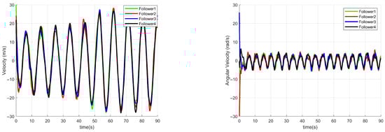 Figure 9 illustrates the path-following effect of the follower UAVs, and it can be seen that the four follower UAVs finally realized the parallel following task along the route planned by the virtual leader. While Figure 10 demonstrates that the proposed control algorithm makes the system maintain good following performance despite external disturbances. The path-following errors of the four follower UAVs converge asymptotically to zero, successfully completing the formation convergence task to maintain cooperative consistency. Figure 11 visually illustrates the linear and angular velocities of each follower. It reveals that under actual disturbances, their dynamic stability during the convergence process exhibits small-scale fluctuations within the range [−1, 1].