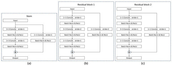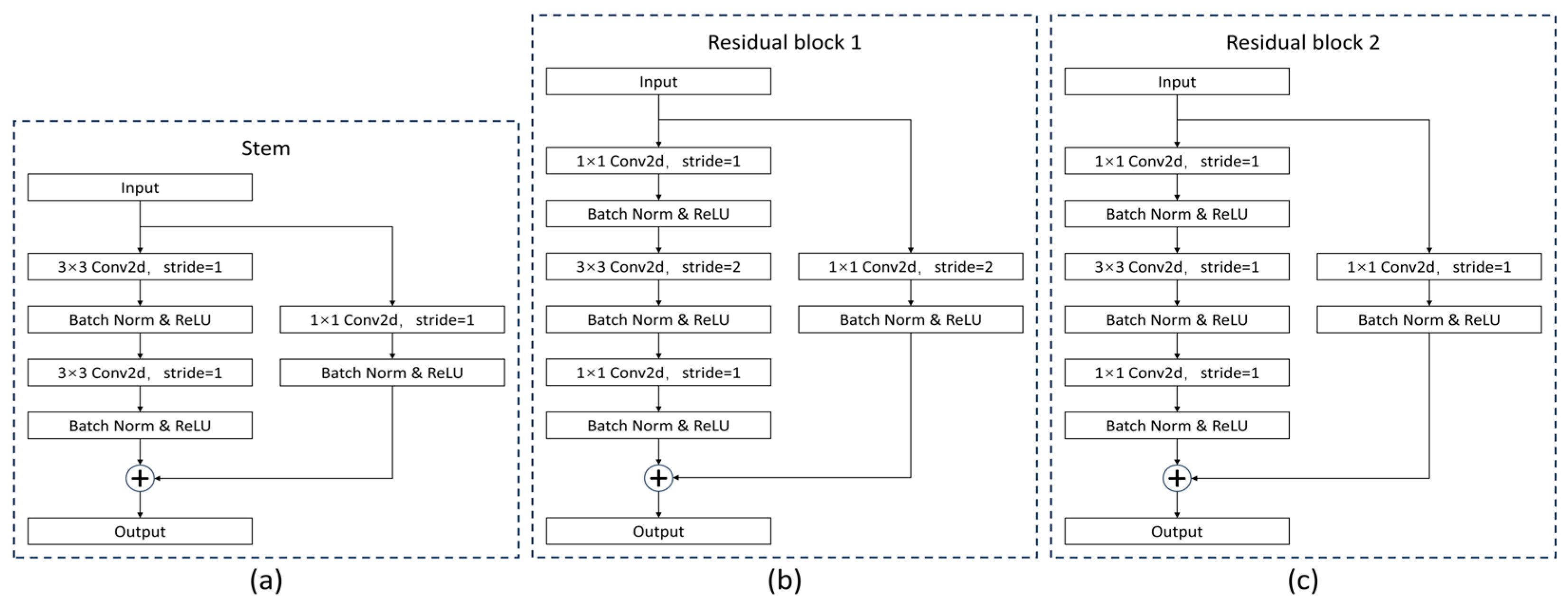 - Residual block 1: This block replaces max-pooling with stride = 2 convolution for downsampling, minimizing information loss.