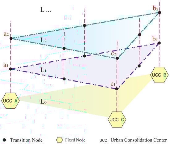 In the freight distribution problem considered in this study, AFVs are assumed to realize the transportation of goods between UCCs, where goods are aggregated and subsequently redistributed for last-mile delivery (see Figure 1). Vertiports designated for take-off and landing are assumed to be located either within or in close proximity to UCCs. Consequently, the terms vertiport and UCC are used interchangeably in the context of the 3D-UAN operational framework, unless otherwise specified.