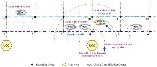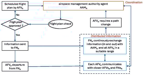 Adjustment of flight parameters may result in a new path generated within the 3D-UAN, based on the information exchanged among AFVs and between AFVs and fixed node agents. In detail, upon receiving approval for its flight plan, the generic  departs from the designated  and proceeds within the 3D-UAN in accordance with the authorized path. Throughout its journey,  exchanges data with other  within an effective communication range and transmits to/receives from  information concerning the state of the 3D-UAN. This communication occurs over a spatial extent equivalent to at least twice the average link length. Specifically, the information refers to the occupancy status of the upcoming links  is expected to traverse. Based on the data received from both s and the neighboring ,  determines whether to continue along its originally planned path or to initiate a route modification. A deviation from the initial path becomes necessary if the  is informed—relative to its current position—that the next link in its planned route has reached its occupancy threshold. To uphold system safety, let d denote the link currently occupied by , and let  and  represent the subsequent links along its intended path.  makes routing decisions based on occupancy information pertaining to both  and . The cooperative, distributed framework in the 3D-UAN environment described above is shown in Figure 3.