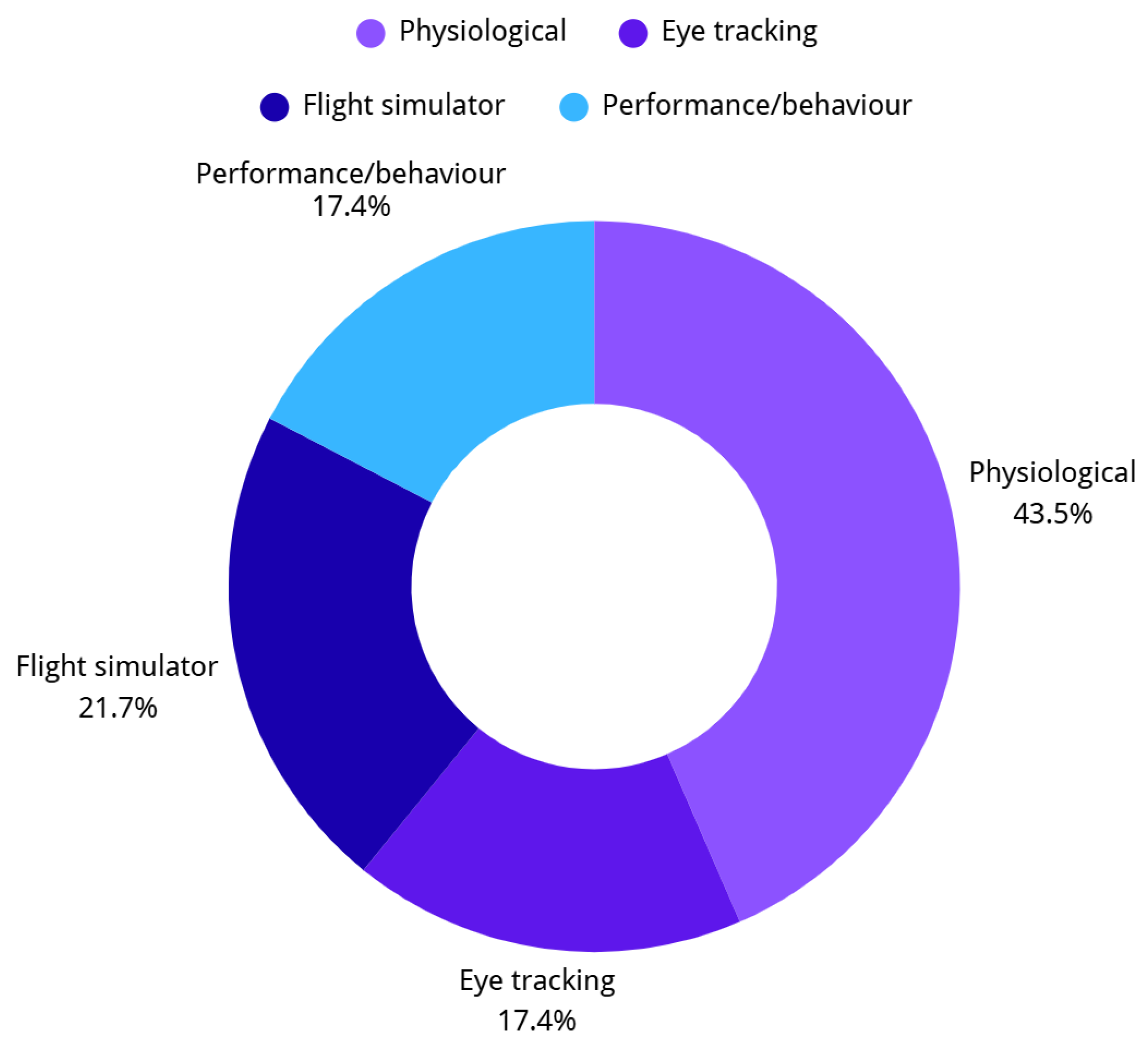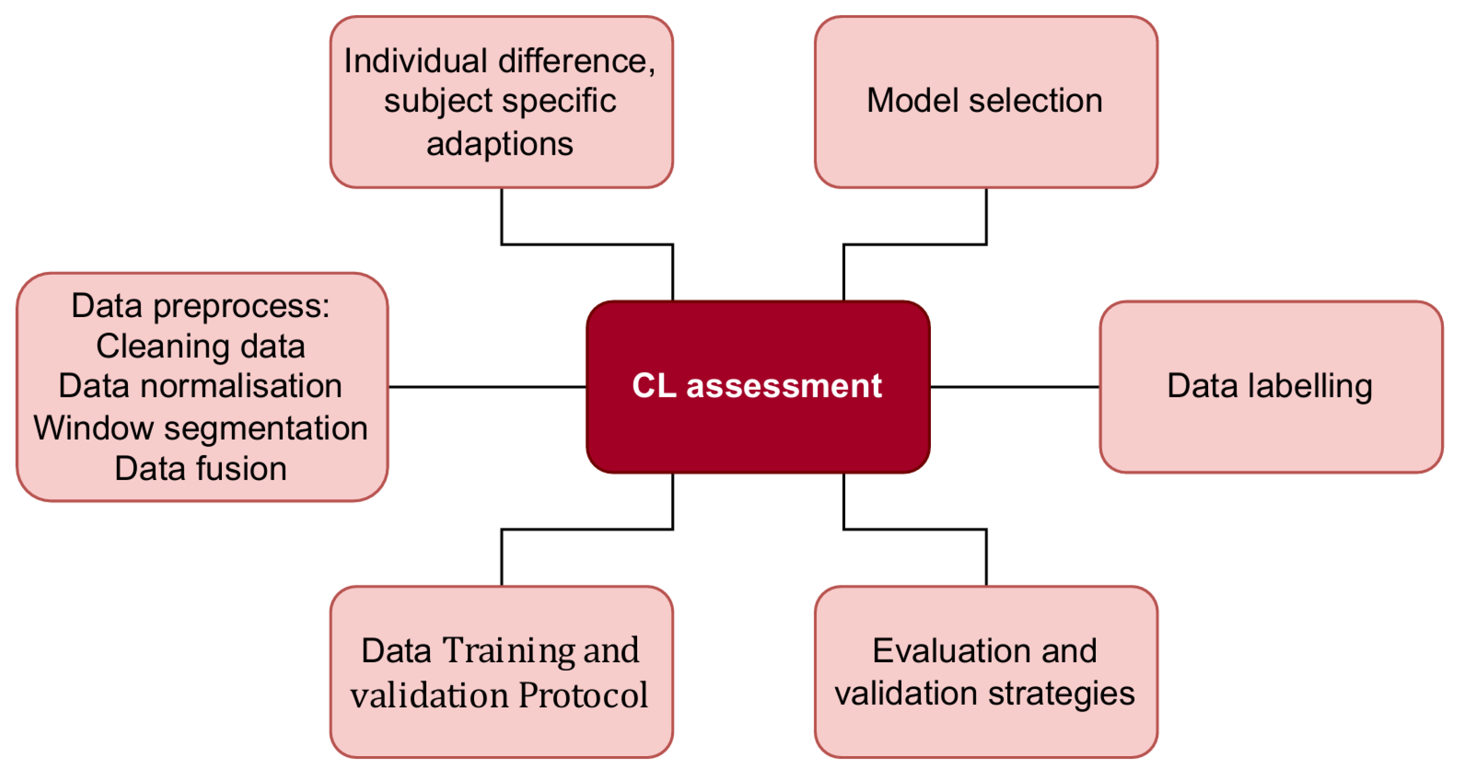 | Sakib et al. [59] | NASA-TLX, CARMA for stress level, heart rate (HR), heart rate variability (HRV), skin electrical activity (EDA), skin temperature (SKT), and behavioural data (e.g., reaction time), (collected from 25 subjects). | Cognitive load, performance, and stress levels: low, medium low, medium, medium high, and high. | SVM showed the best performance in classifying cognitive load. |
