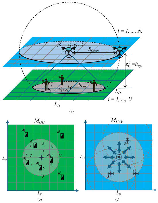 Figure 2. Ground-user observation map ( M G U ) and neighbor–UAV observation map ( M U A V ). (a) Ground user observation map ( M G U ) and neighbor UAV observation map ( M U A V ), perspective. (b) M G U , describe UAV observations. (c) M U A V , Agent’s action space encoded directions.