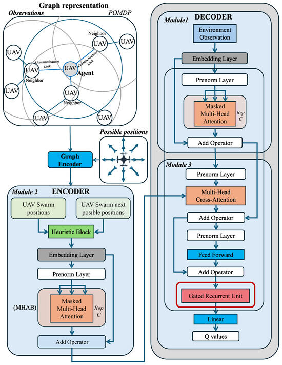 A representative line of work is due to Dai et al. [33], who proposed a deep graph network (DGN) to coordinate UAVs toward multiple objectives in disaster scenarios. The policy aggregates information via graph convolution/attention layers over each drone’s neighborhood on the communication graph, producing node embeddings that guide local actions. In reported evaluations, DGN outperformed non-graph baselines (e.g., a standard DQN and a random movement policy), yielding higher global rewards and improvements in fairness and energy use. These results indicate that structured message passing over the inter-UAV graph can effectively exploit neighbor observations for decentralized coordination.