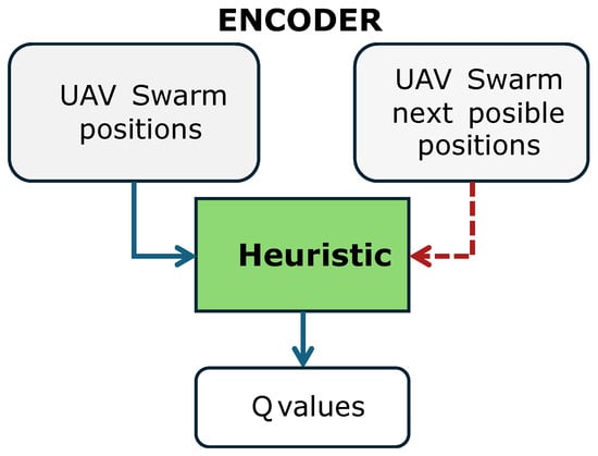 Neural networks require fixed-size input vectors. To satisfy this constraint, the UAV’s observation space is discretized within circular perimeters of radius R cov (for GU detection) and R comm (for neighbor detection). All grid points inside these radii are indexed in a fixed order (left to right, bottom to top) relative to the UAV’s position. This indexing remains consistent as the UAV moves, encoding detected entities into two maps: the ground-user observation map M G U and the neighbor–UAV observation map M U A V , shown in Figure 2a.