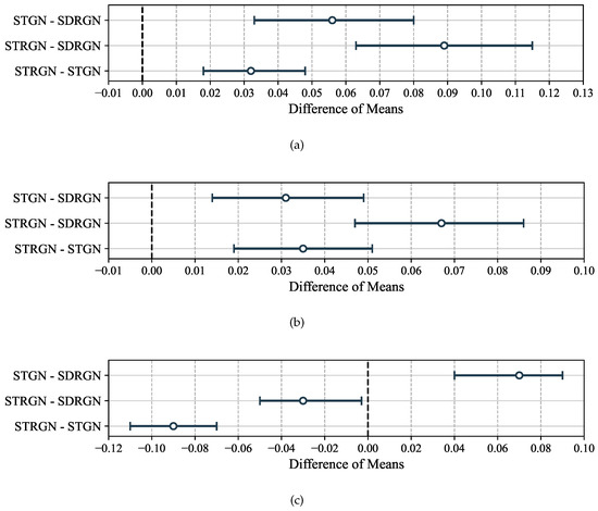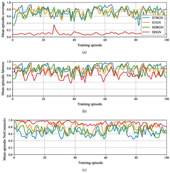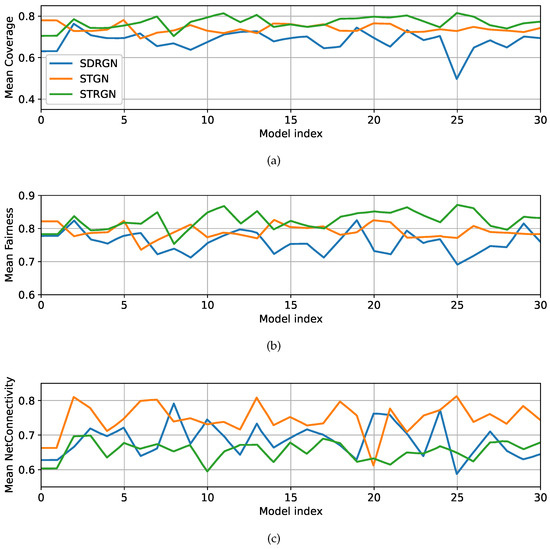 The variance analysis confirmed that the proposed STGN model provides statistically significant improvements in network connectivity for mobile ground users when compared with the baseline SDRGN. For coverage and fairness, both STRGN and STGN consistently outperformed SDRGN, with STRGN achieving higher coverage but at the cost of reduced connectivity. In contrast, STGN maintained balanced performance across all three objectives, demonstrating its ability to better manage the inherent trade-offs of the Ground User Coverage Problem (Figure 5). These results suggest that STGN offers a more reliable compromise between maximizing coverage and fairness while safeguarding network connectivity, a balance that is essential for emergency communication scenarios.