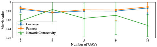 The scalability experiments revealed how changes in ground user density and UAV swarm size influence model behavior (Figure 10). Increasing the number of ground users improved coverage and fairness up to a saturation point, after which additional users did not yield significant gains. However, connectivity did not follow a stable pattern, indicating that mobility dynamics introduce variability in swarm link maintenance. Based on these results, terrains with around 35 users appear to offer an effective balance between coverage and connectivity, serving as a useful guideline for deployment scenarios.