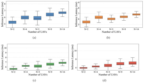 We define the per-decision (policy) inference latency T infer as the elapsed wall-clock time to compute one forward pass of the learned policy on a single UAV, mapping its local observation (including neighbor-encoded features) to a discrete action. In our plots, each box aggregates, over 100 episodes, the per-episode mean of T infer (in milliseconds). Thus, the box median approximates the typical per-step forward-pass time under a given ( U , N ) condition.
