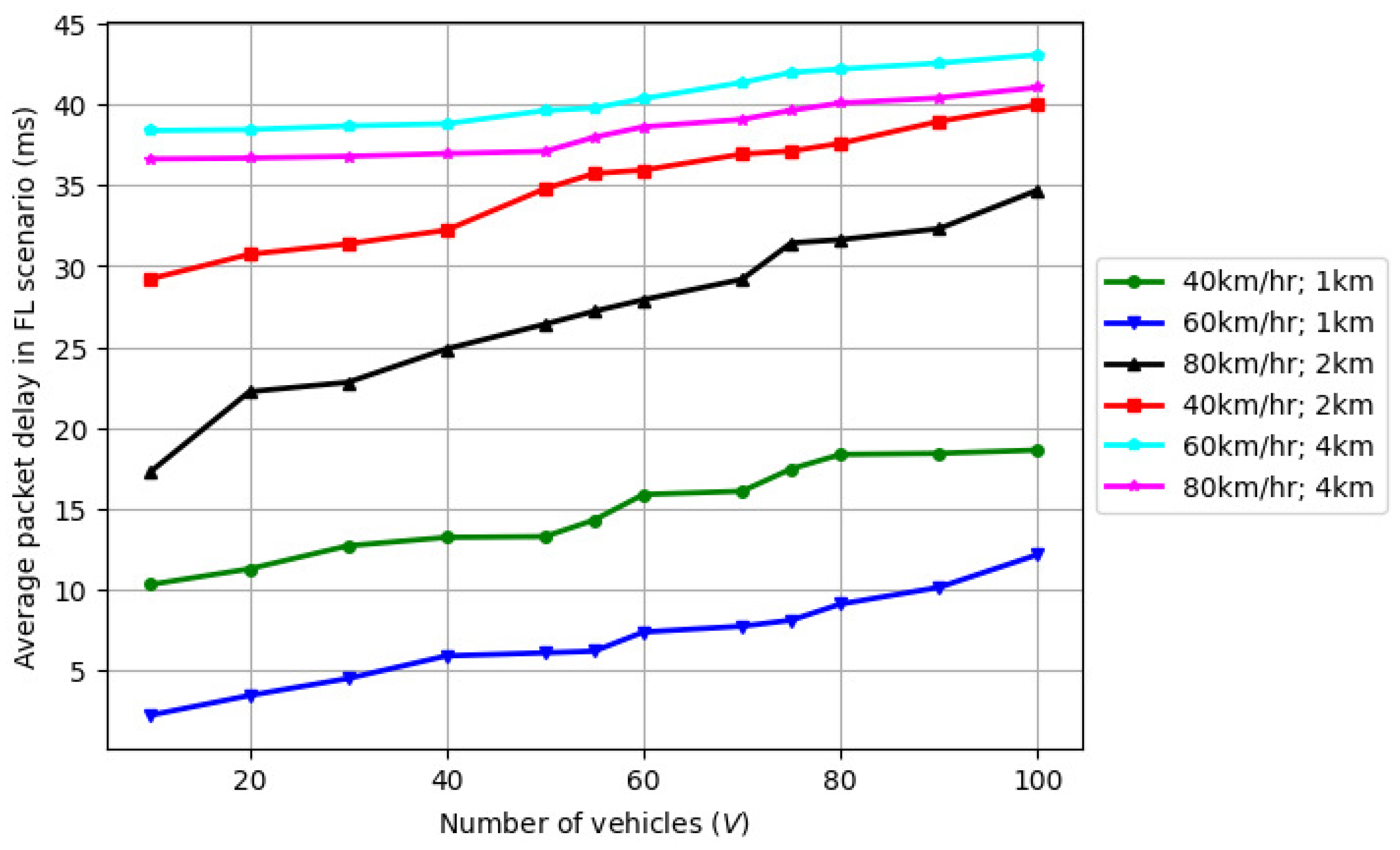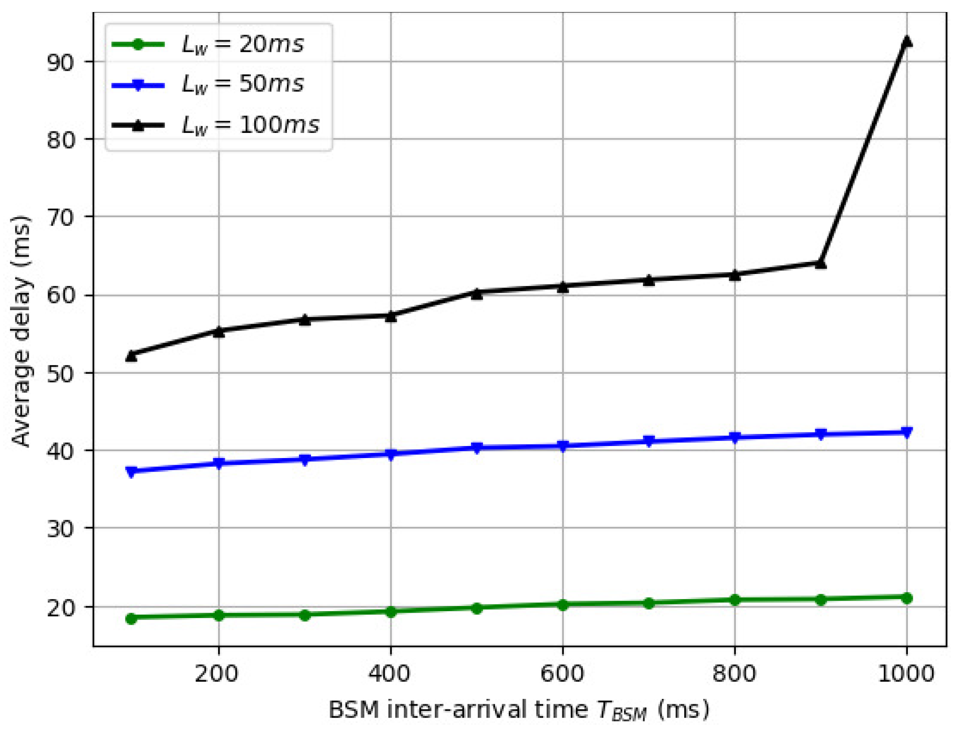 5.2. Variation in Average Delay with Inter-Arrival Time of BSM and CPM Packets with (V)