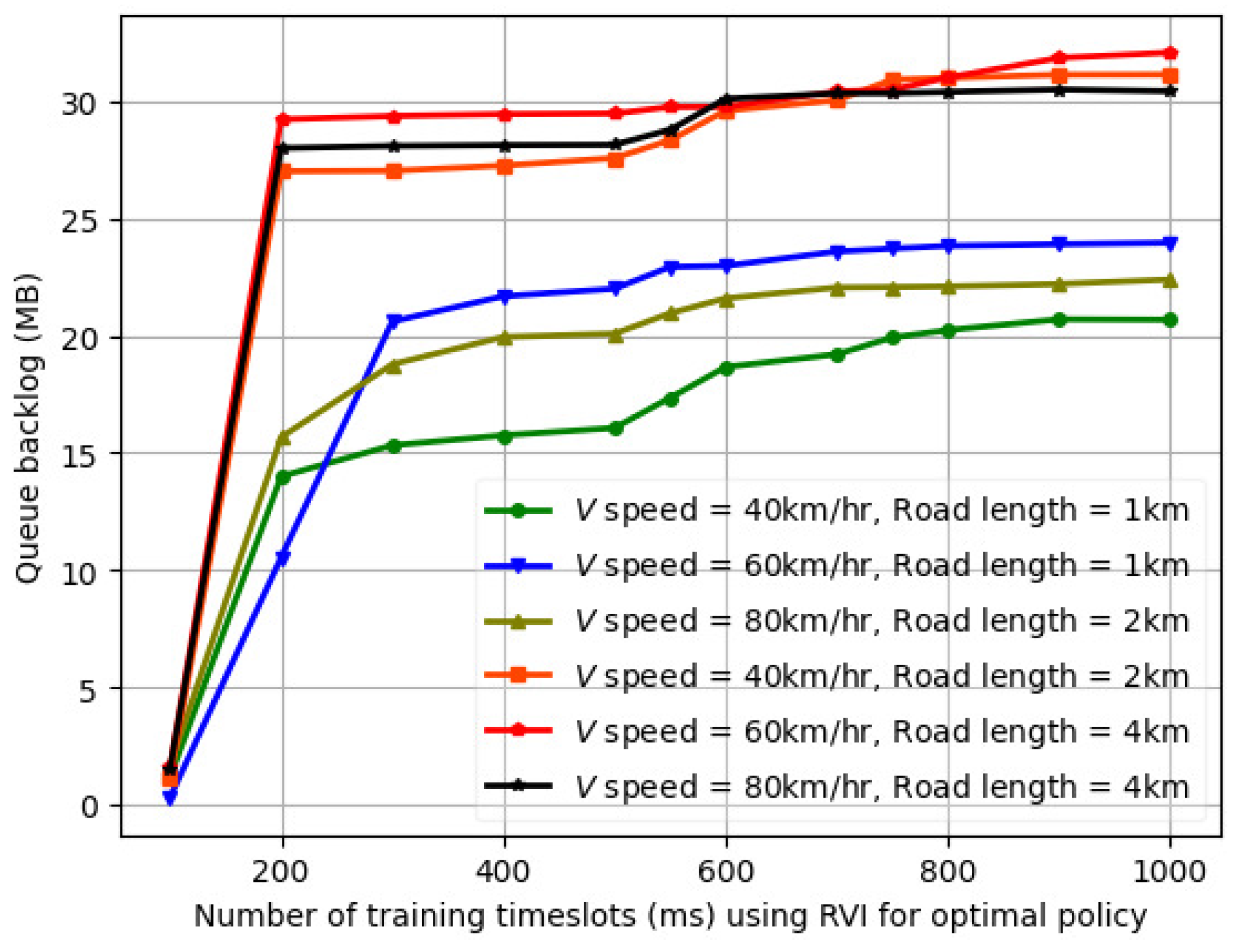 5.1. Variation in Transmission Window Length () and Queue Backlog with Varying Number of Vehicles (V)