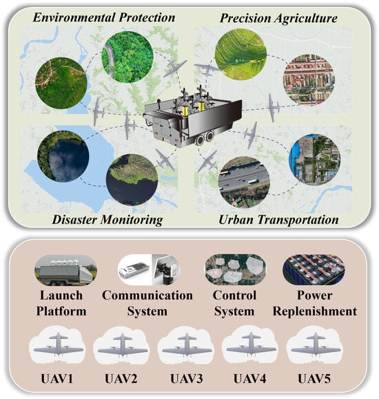 However, the launch, recovery, and coordination of multi-UAV systems require extensive preparatory work, which constrains operational efficiency and substantially increases costs. To enhance deployment flexibility and sustained operation in remote-sensing applications, ground vehicles can be transformed into mobile platforms that integrate UAV transport, rapid deployment, launch and recovery, onboard data processing, and energy replenishment—hereafter referred to as VM-UAV systems [,]. These vehicle-mounted platforms not only overcome the transportation, power, and onboard computing bottlenecks faced by small- and medium-sized UAVs during field operations, but also markedly expand the operational envelope of UAVs, showing great potential for time-sensitive tasks such as rapid mapping and disaster response, as shown in Figure 1.