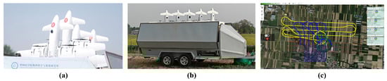 (a,b) Prototype of the vehicle-mounted multi-UAV system. (c) Multi-UAV Ground Control Station in flight experiment.