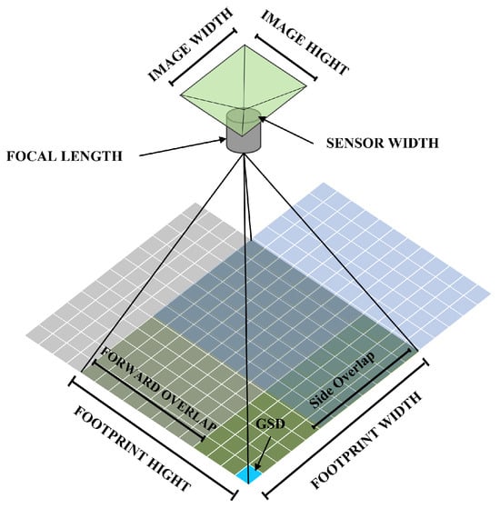 The ground sampling distance (GSD) refers to the distance between the centers of two adjacent pixels on the ground and can be automatically calculated based on the sensor width using Equation (8).