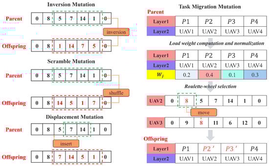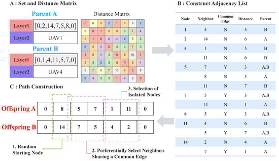 The MRECX operator is applied with a probability to create a pair of offspring chromosomes and from a pair of parent chromosomes and . This crossover only applies to the UAV’s regional visit paths. If crossover is performed, for each corresponding UAV index , MRECX extracts the parent routes and , determines the unique set of task nodes to be visited by as