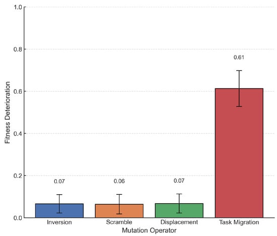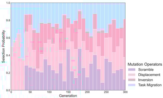 To validate the selection of mutation operators, an ablation study was conducted by removing one mutation operator at a time from the AHM mechanism and running 30 repeated experiments on Dataset IV. Figure 11 shows the deterioration in the best fitness compared to the full proposed model after removing the respective operator. Unsurprisingly, Task Migration is a crucial component for balancing task allocation, its removal resulted in an average fitness degradation of 0.61. Removing the other mutation operators led to a fitness degradation of 0.06 and 0.07. However, their contributions remain essential, as the diversity of strategies helps the model avoid local optima. This is further supported by the changing application probabilities of the mutation operators over the course of iteration, as illustrated in Figure 12. In the first 50 generations, when the population has not yet converged, Displacement and Task Migration can quickly break down structures, stimulate diversity, and actively optimize. In the middle phase (generations 50 to 200), as the model gradually stabilizes, Scramble introduces new structures to further expand the exploration of the solution space, while Inversion maintains a moderate level for fine-tuning. In the final phase (after generation 200), the probabilities of Scramble and Task Migration decrease as the system favors stable structures, using the other operators for local refinement and expanding the solution boundaries.